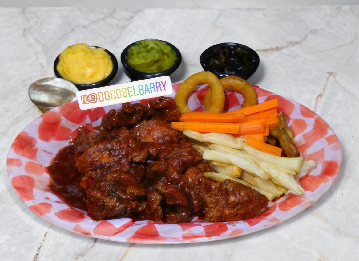 1 kg. de pollo, papas y aros de cebolla.