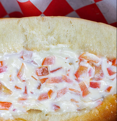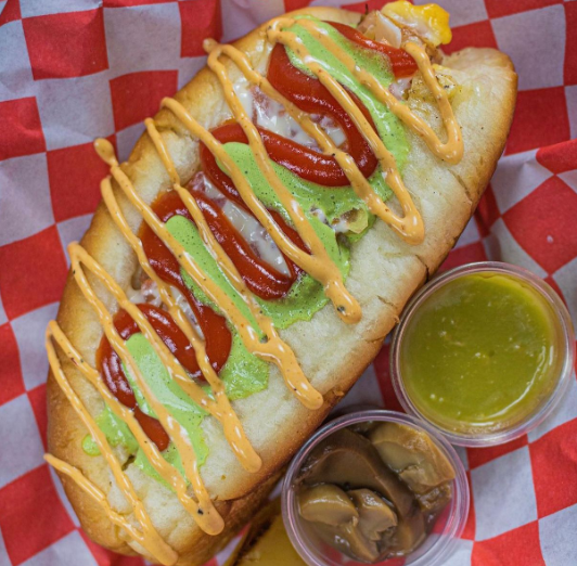 Salchicha, tocino, queso chihuahua, queso Philadelphia, queso amarillo, pan casero. Todos los dogos incluyen tomate, cebolla cruda, cebolla asada, mayonesa y papas.