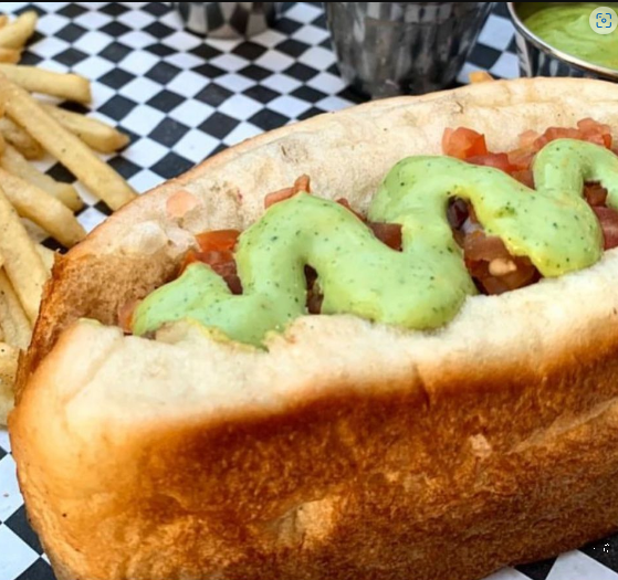 Salchicha, tocino, pan casero. Todos los dogos incluyen tomate, cebolla cruda, cebolla asada, mayonesa y papas.