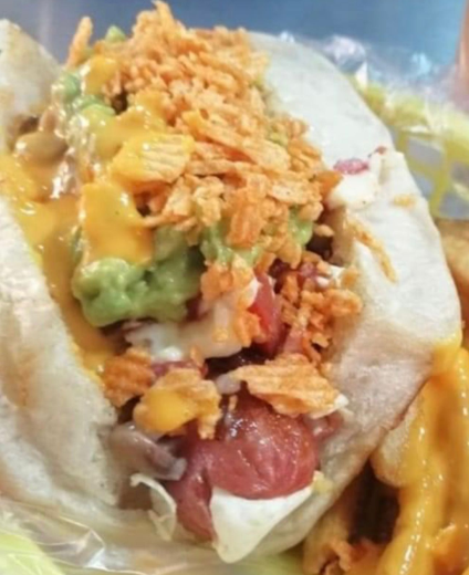 Tortilla de harina, salchicha, queso Philadelphia, queso amarillo, queso chihuahua, jamón, tocino, pan casero. Todos los dogos incluyen tomate, cebolla cruda, cebolla asada, mayonesa y papas.