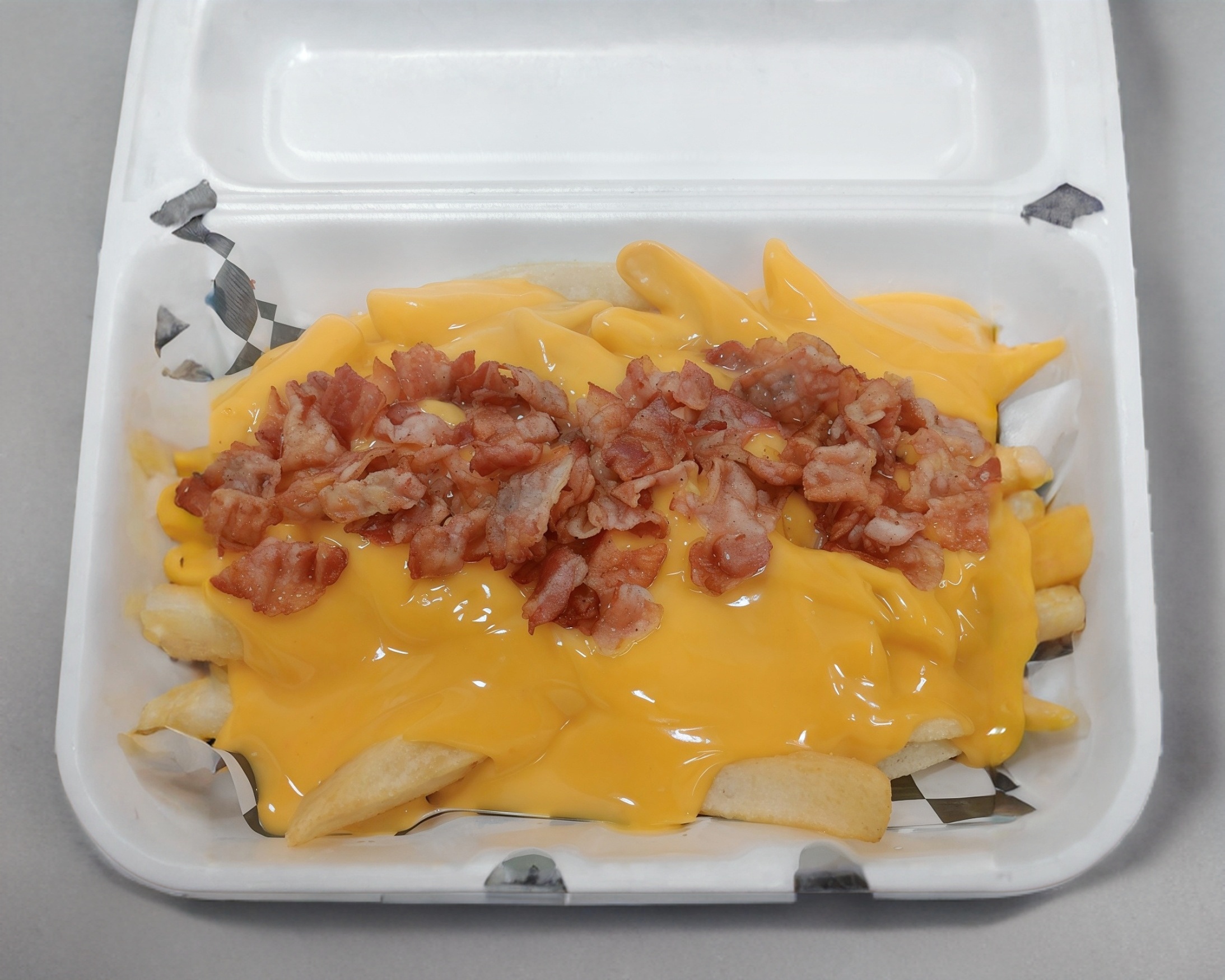 Papas a la francesa, queso cheddar, porción de tocino frito