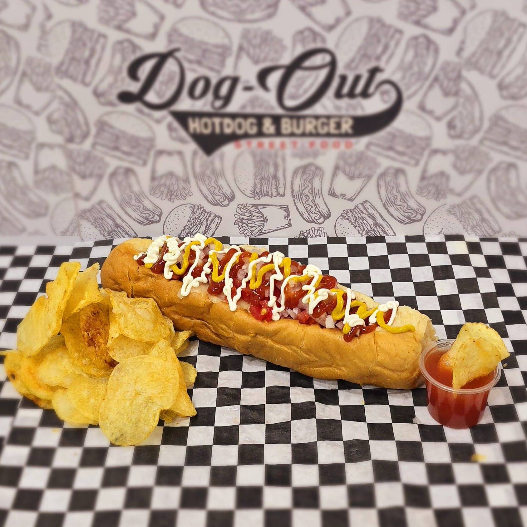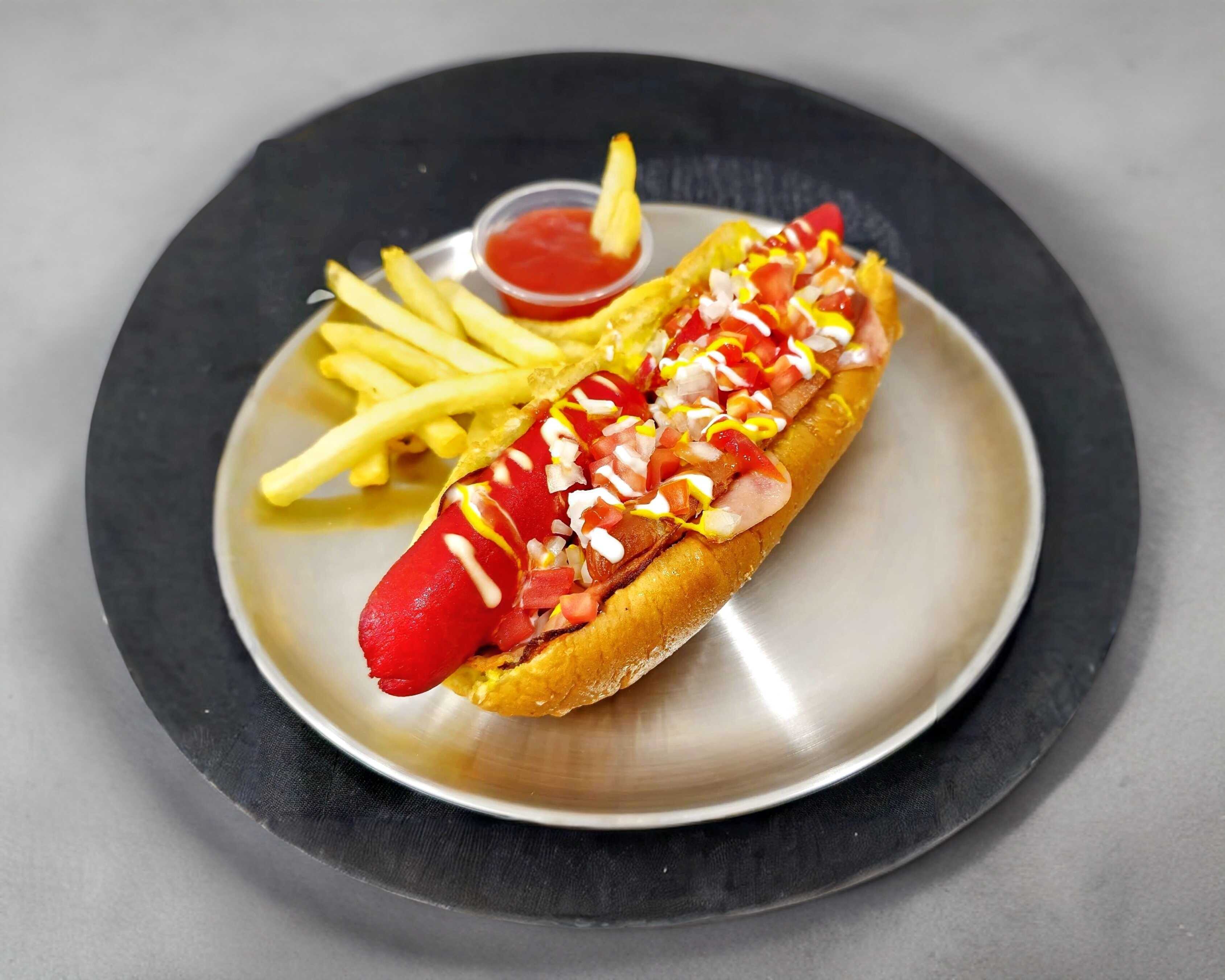 Pan casero jumbo, salchicha de pavo jumbo, queso mozarella derretido, tocino, tomate, cebolla acompañados de 200 grs. de papas