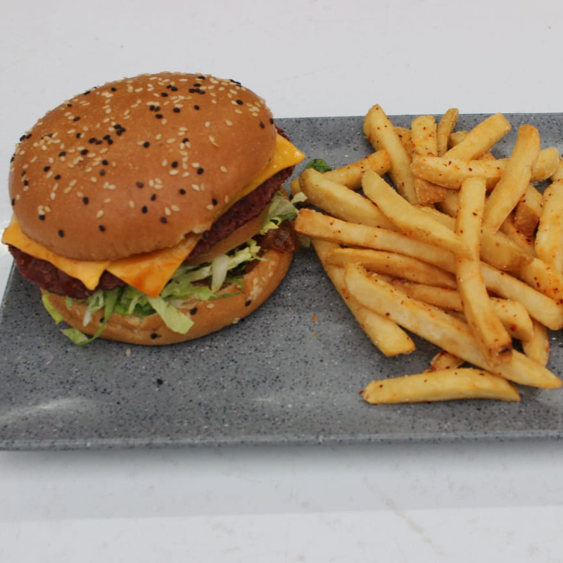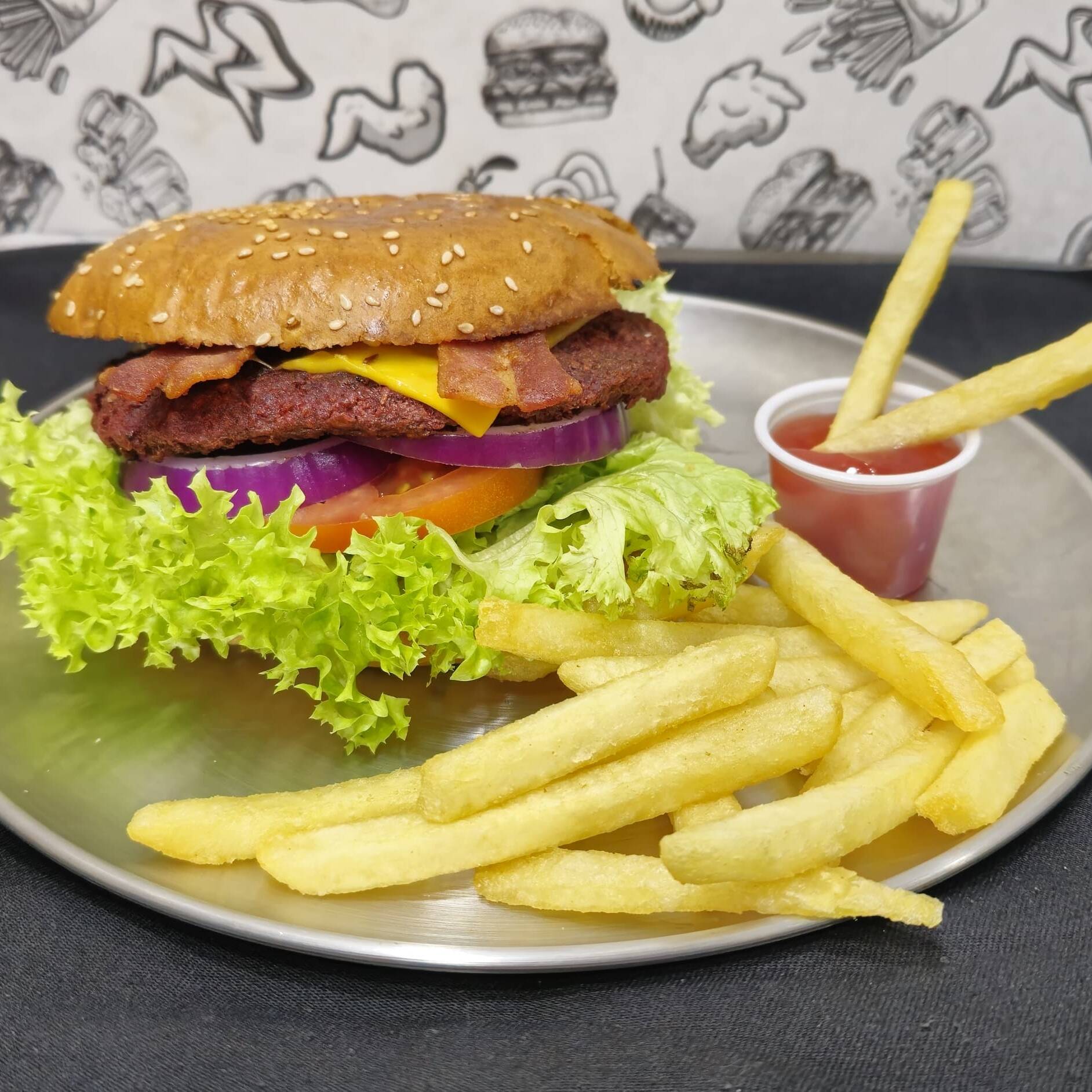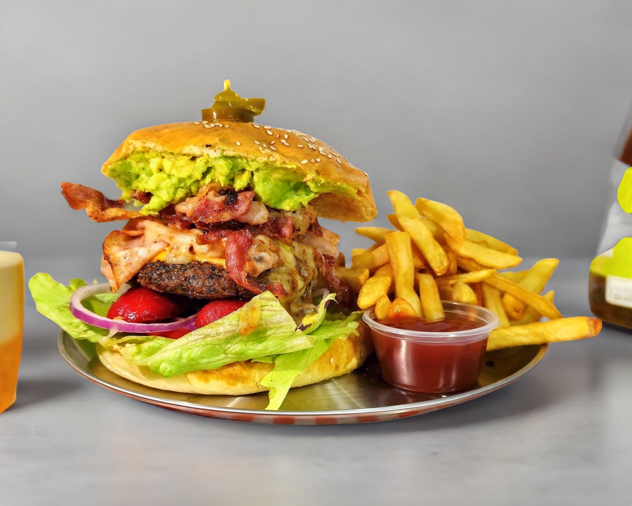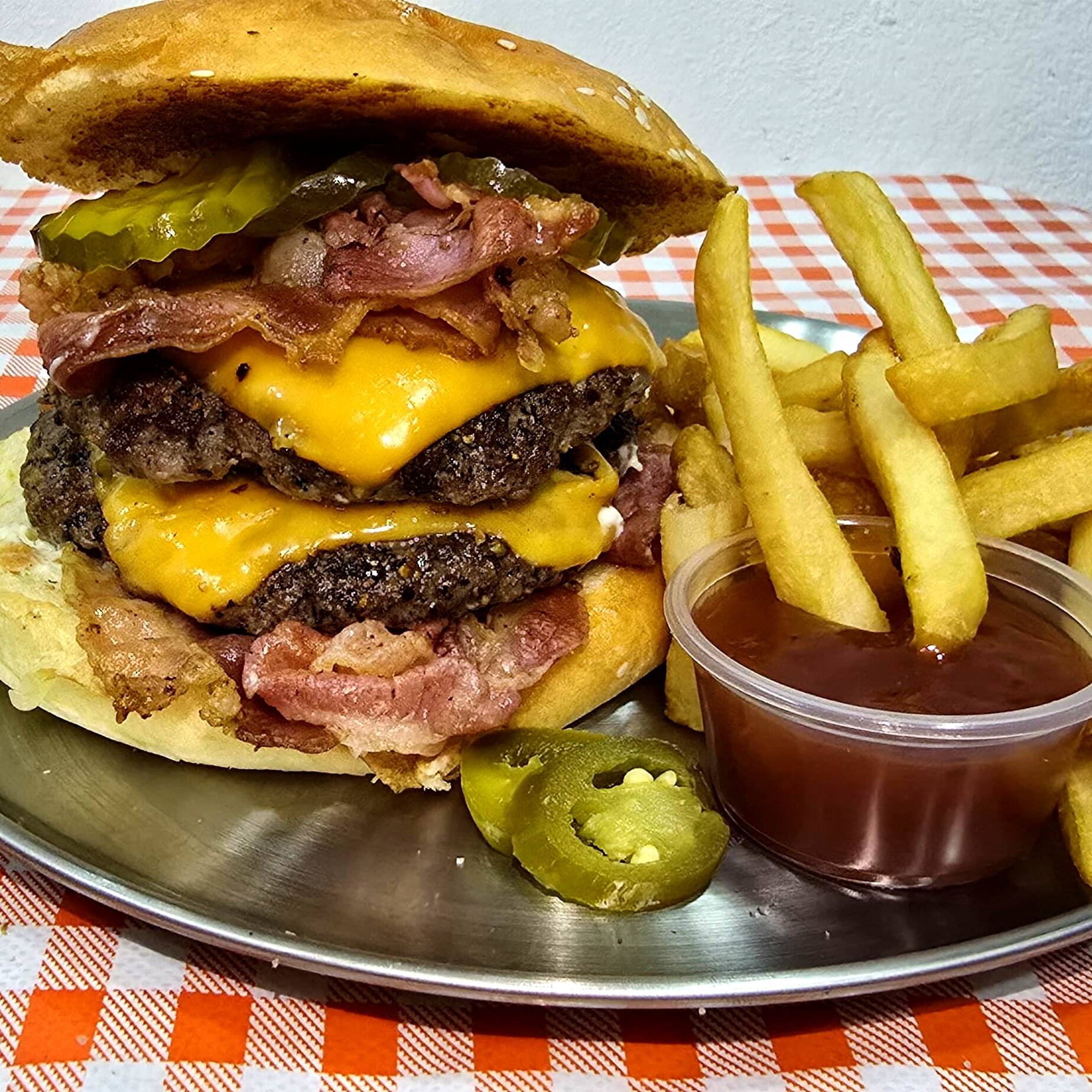 Pan casero, 300 gr. de carne de res, doble porción de queso americano, doble porción de tocino, pepinillos y aderezos, acompañada de una porción de papas