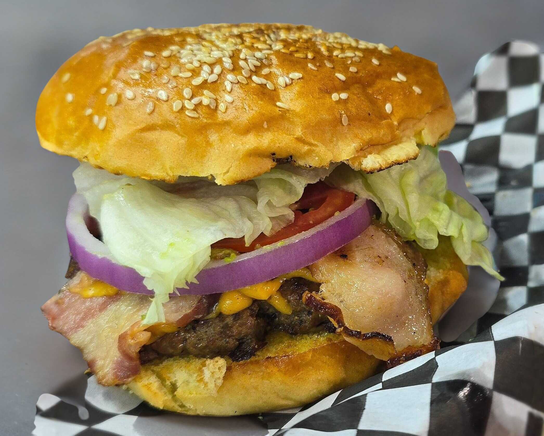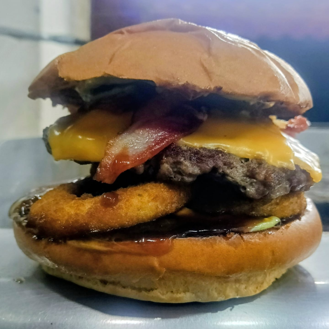 Carne de res asada a la plancha 2 tiras de tocino, 2 rebanadas de queso americano, aros de cebolla empanizados y salsa BBQ