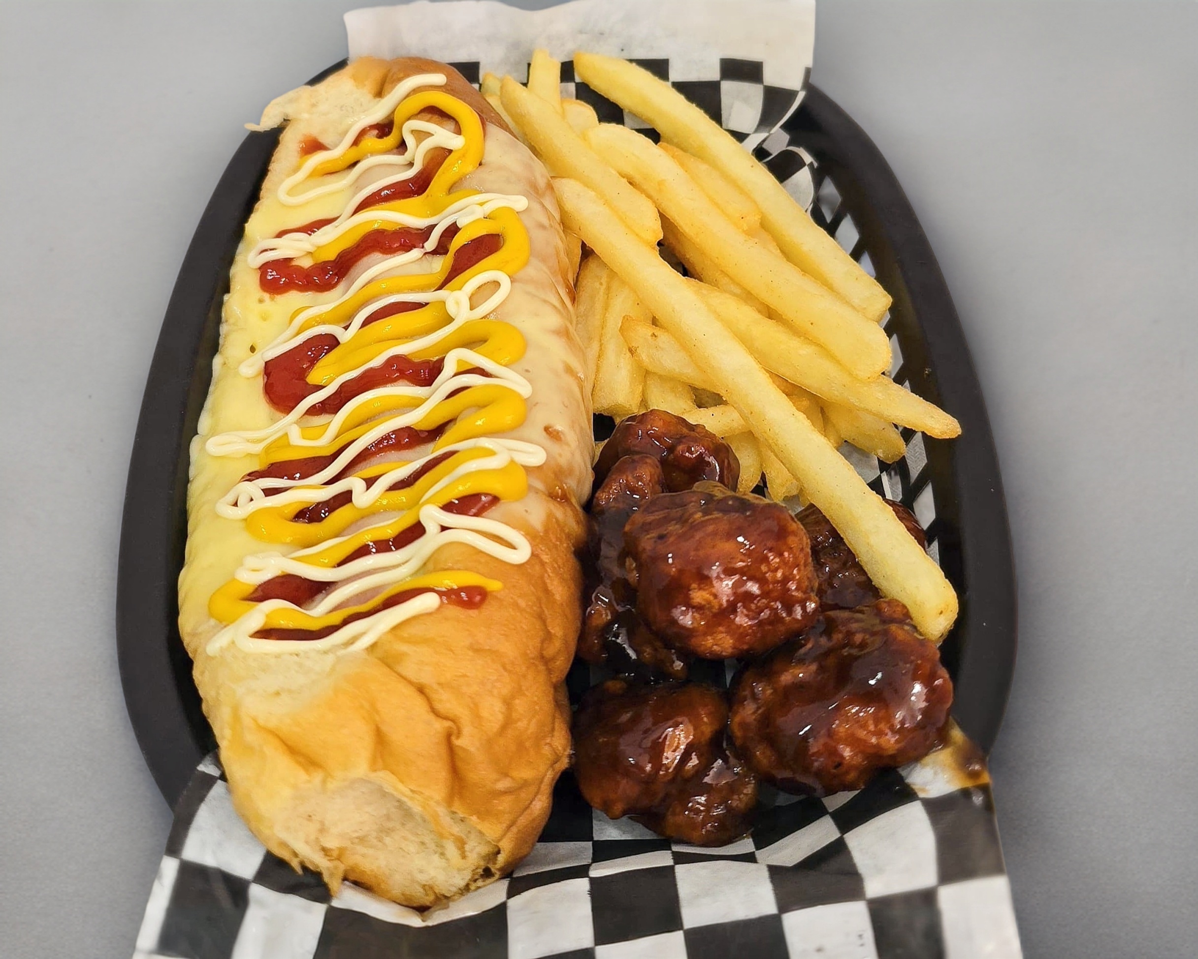 Hot dog jumbo, con pan casero jumbo, salchicha jumbo, queso chihuahua, aderezo de la casa, verduras del dia, con una porcion de papas y una porcion de boneles