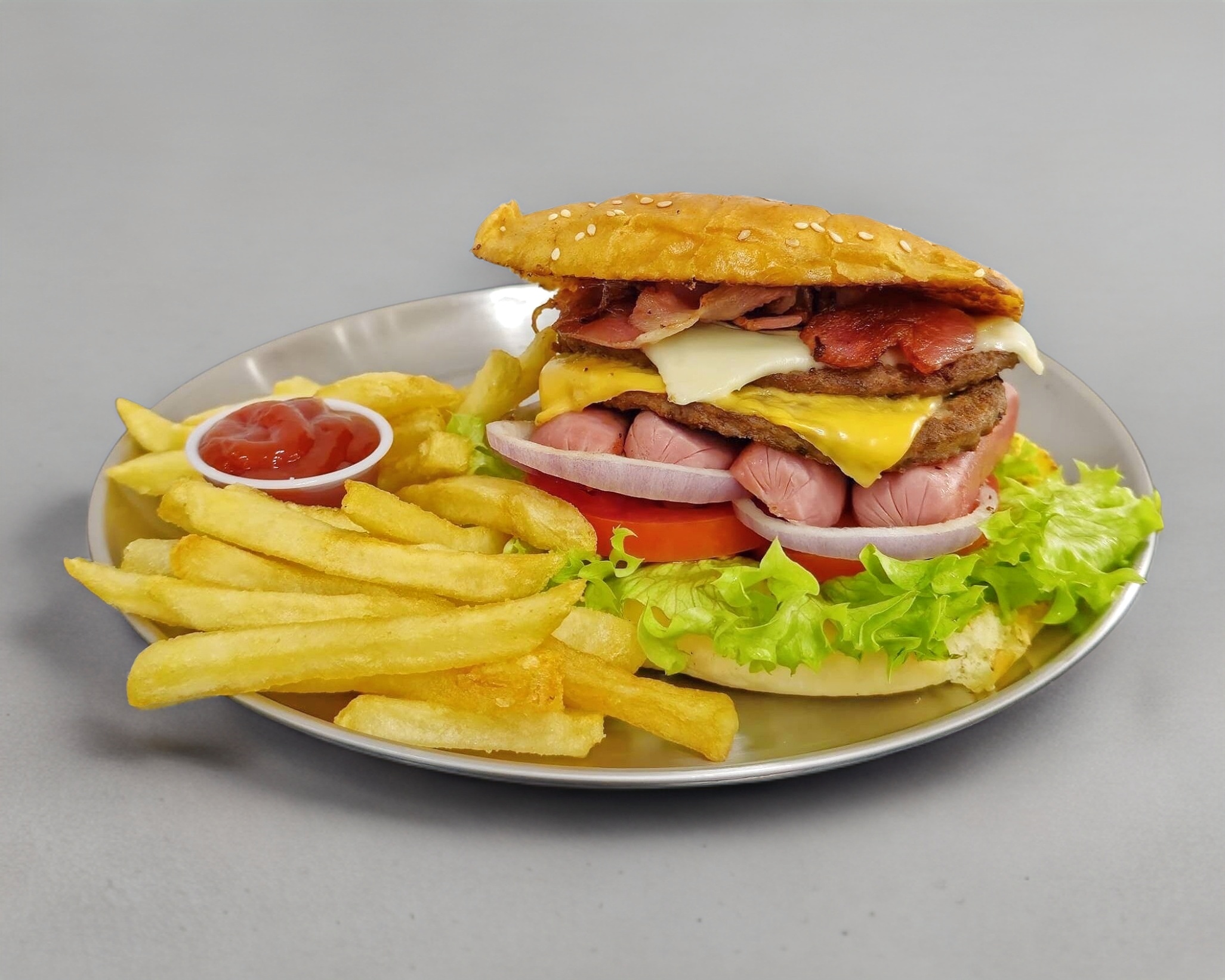 doble carne, queso amarillo, queso suizo, salchicha de pavo, tocino, vegetales frescos y papas fritas