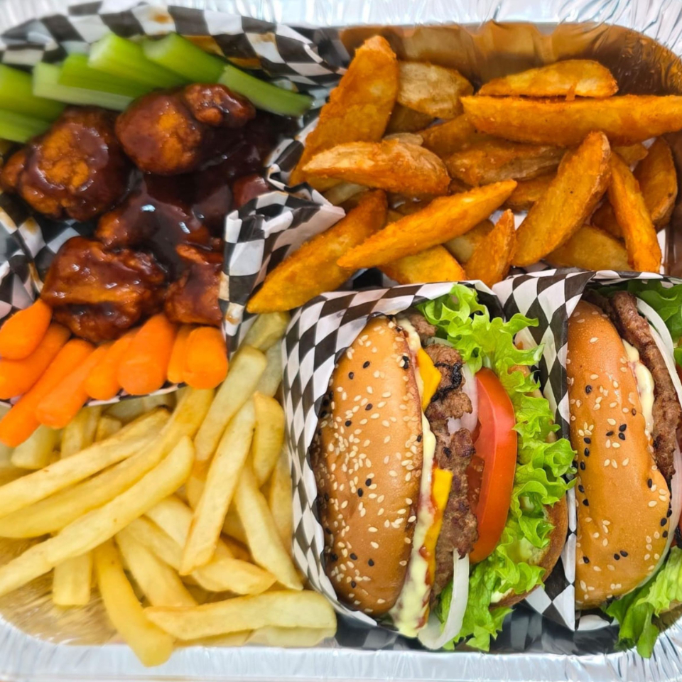 2 hamburguesas blicher Jr, 1 orden de boneless, 250 grs de papas a la francesa y 250 grs de papas gajo acompañado de aderezos de la casa