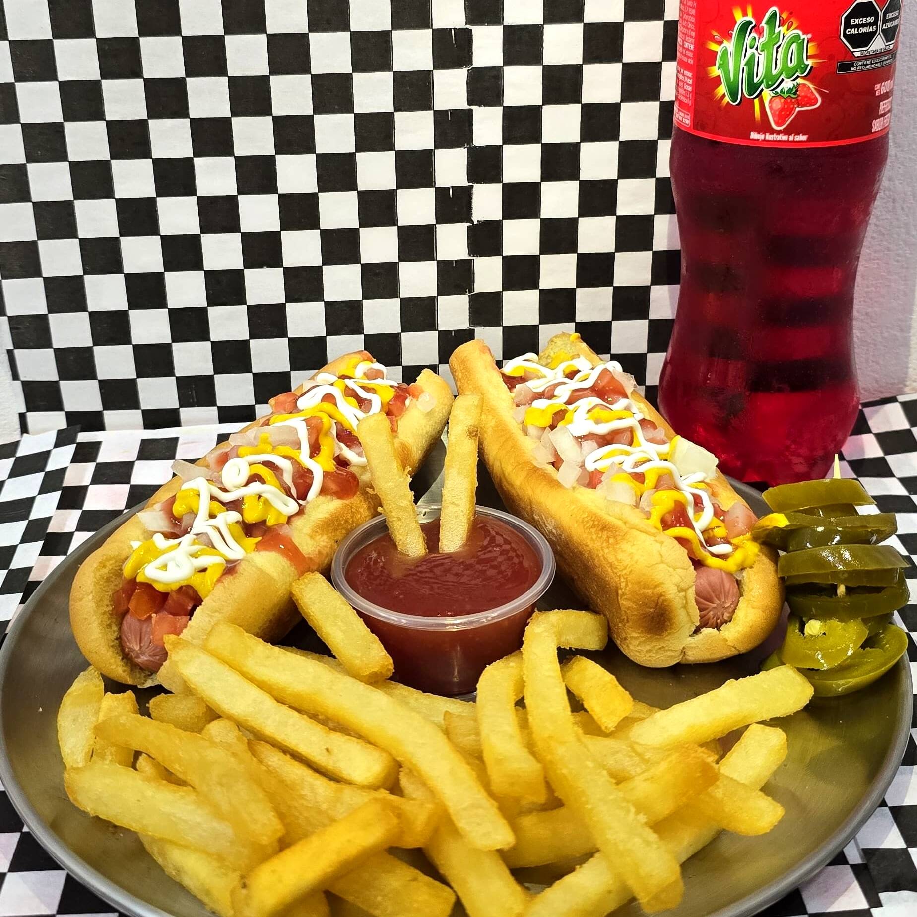 2 hot dogs clásicos acompañados de papas a la francesa ( 200 gramos) y refresco de tu preferencia ( 400 ml).