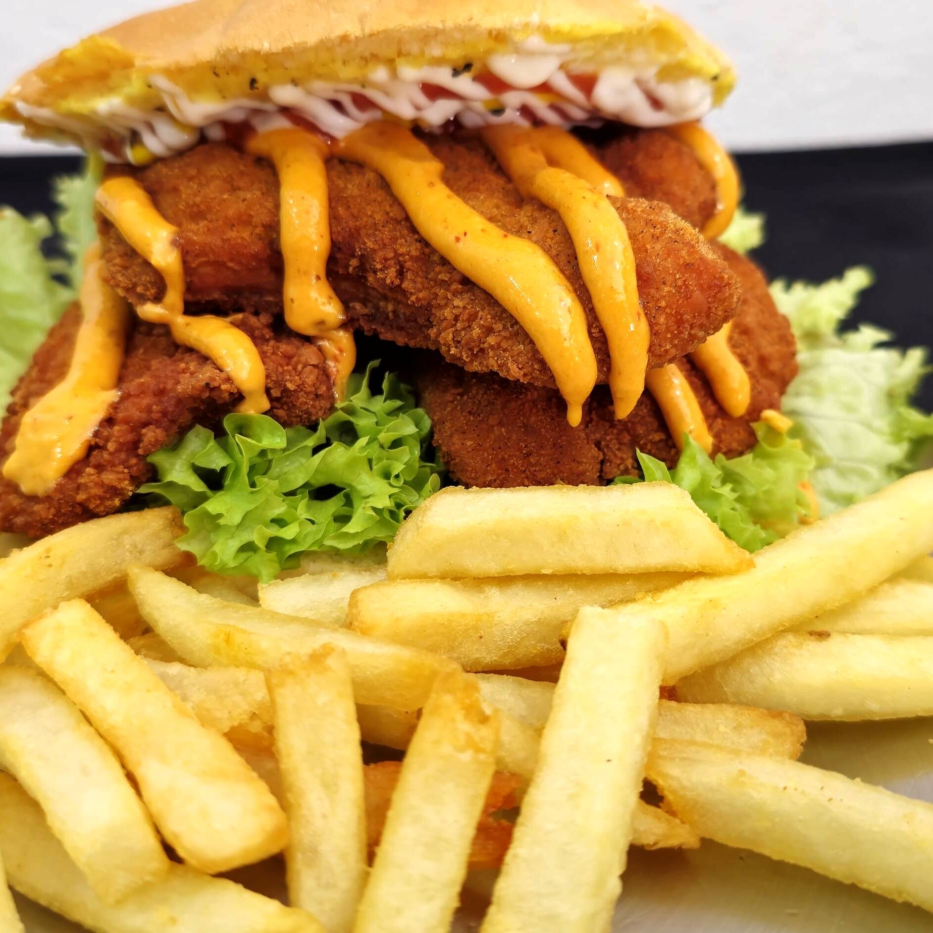 Pan casero, 200 gr de pechuga de pollo crujiente bañada en salsa de chipotle con tocino, acompañada de una porción de papas