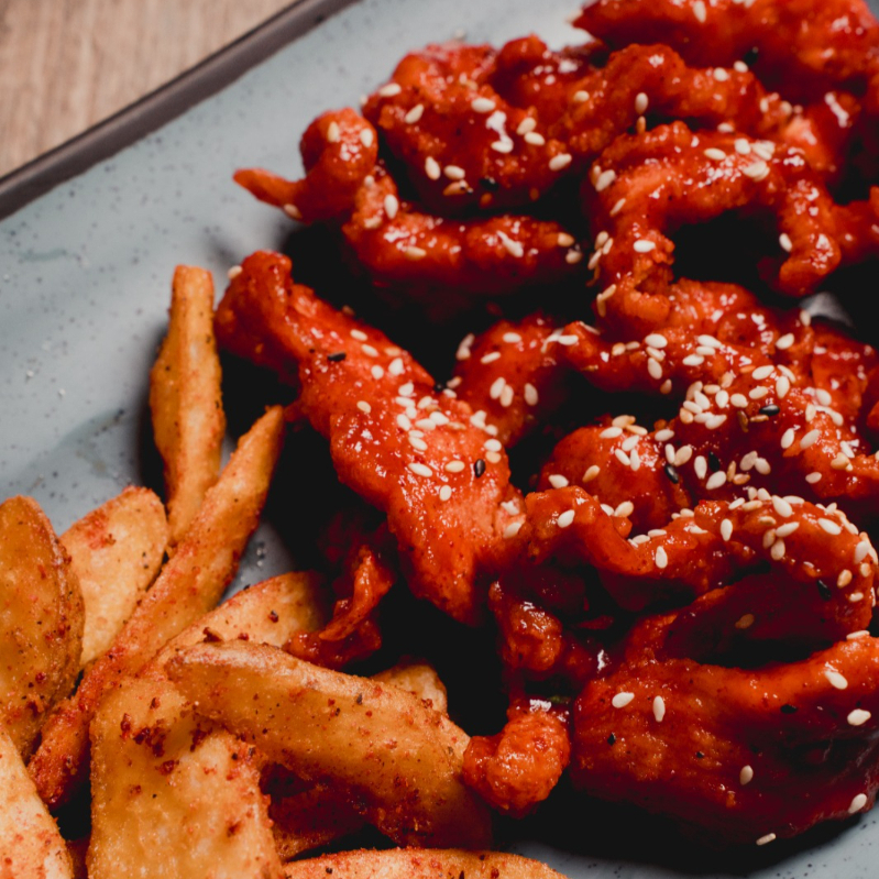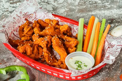 250gr de tiritas de pechuga de pollo sin hueso, capeadas y bañadas en salsa a elegir, acompañadas de zanahoria y aderezo ranch.