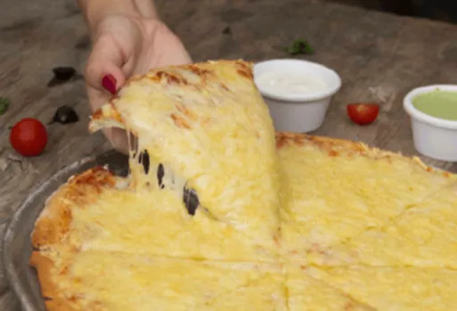 Pizza con queso gouda, chester, chihuahua y parmesano.