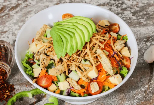 Delicioso pollo al limon (80gr), mix de lechugas, zanahoria, col morada, pepino, tomate cherry, cubitos de queso, frituras de maíz y aguacate, bañada en aderezo de cilantro.