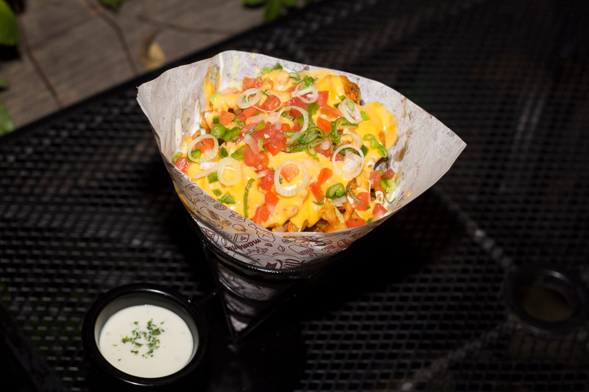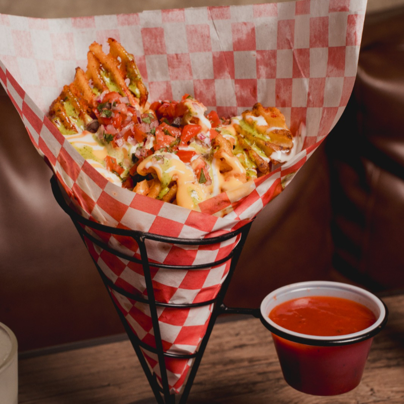 Nuevas papas tipo waffle(400gr) bañadas en queso de nachos, aderezo de cilantro con aguacate y crema ácida, coronadas con pico de gallo.