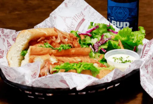 Baguette de pollo empanizado (130gr), cebolla crujiente, lechuga y aderezo ranch.