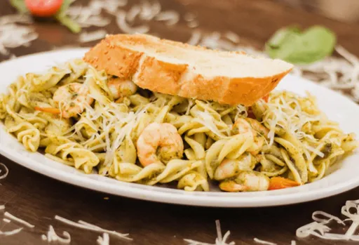 Exquisita pasta salteada con tomate cherry y camarones a la mantequilla (90gr), bañada en pesto de la casa con queso parmesano, acompañada de pan con mantequilla.