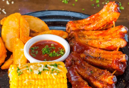 Exclusivas costillitas de cerdo al horno de leña (400gr), bañadas en nuestra salsa BBQ SPICY del chef, acompañadas de papas gajo con una porción de jugoso elote dulce con parmesano y perejil.