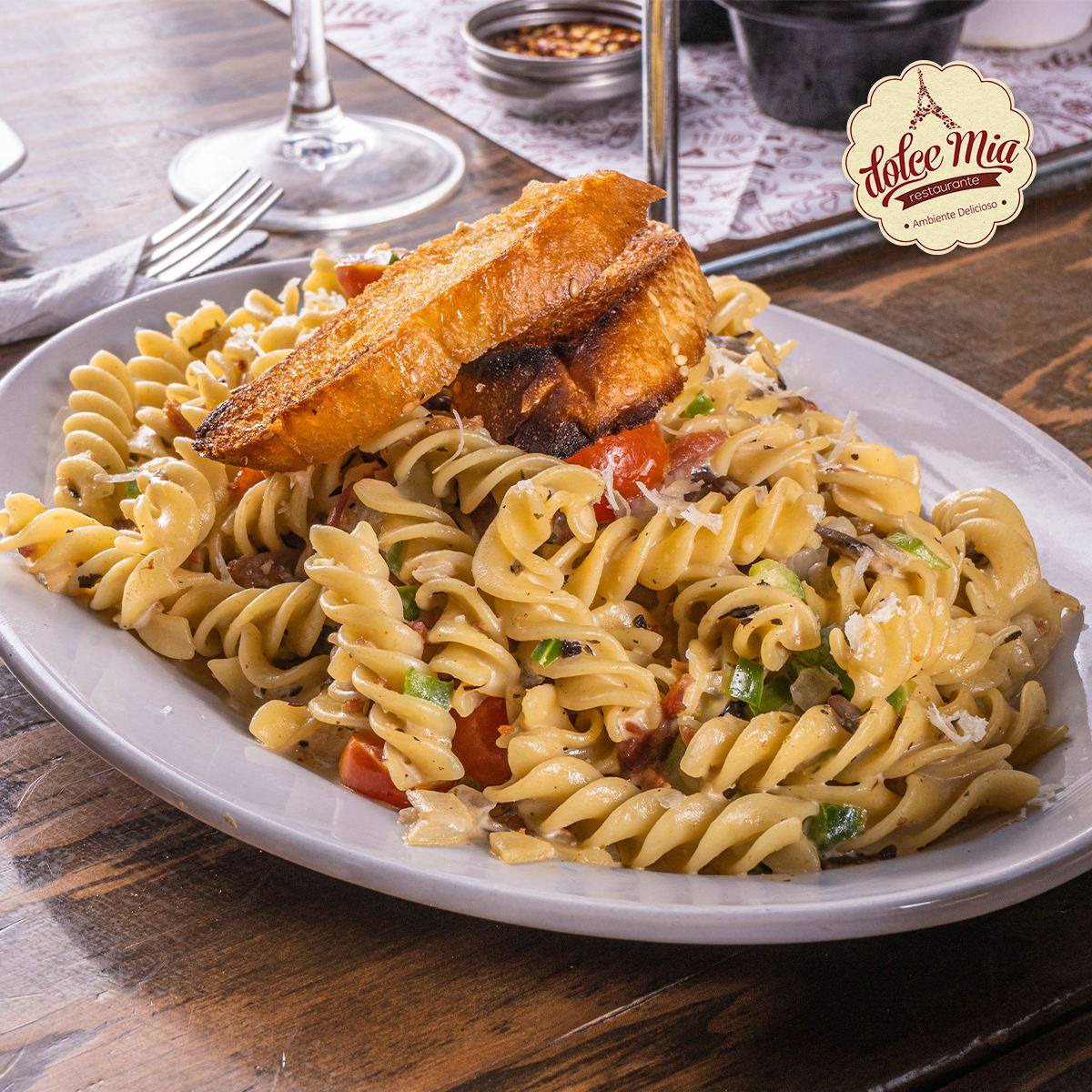 pasta con tocino, champiñon, tomate, cebolla y morrón, con un toque de salsa blanca y queso parmesano.
