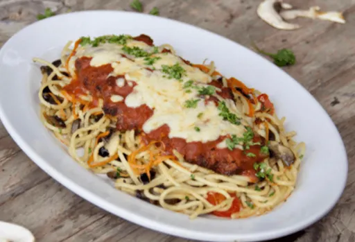 Tradicional pollo (150gr) italiano empanizado con parmesano sobre una cama de pasta al burro, bañado en salsa de tomate de la casa y gratinado al horno de leña.