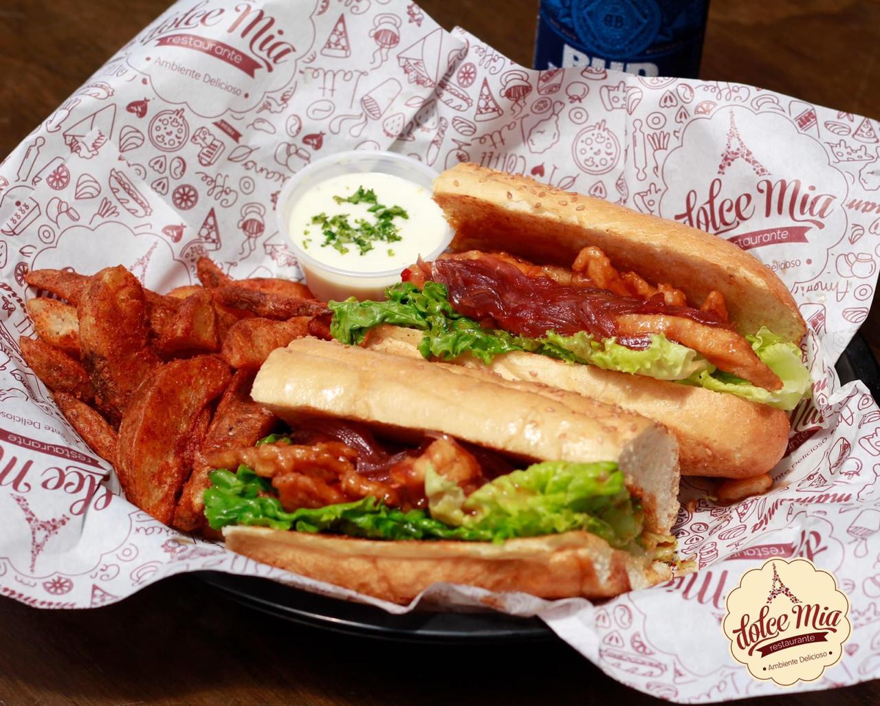 Riquísimo baguette de pollo, combinación de lechugas, toamte, pepino, morrones, aguacate, germinado de alfafa, aceitunas negras y queso, acompañado de aderezo ranch