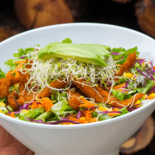 Rico pollo empanizado con nuestra receta secreta (130gr), zanahoria, col morada, granos de elote, tomate cherry, germinado de alfalfa y aguacate, aderezada con chipotle.