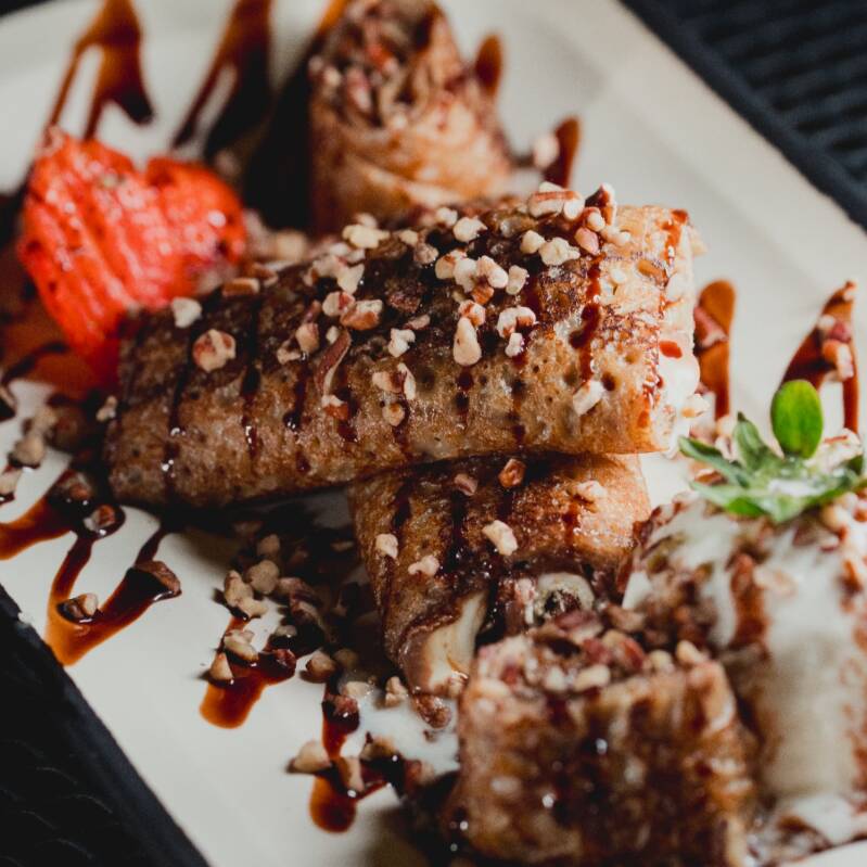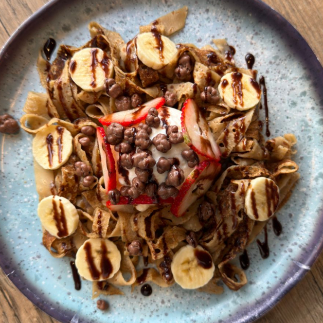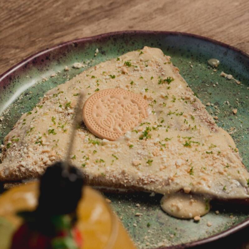 : Disfruta de nuestra deliciosa crepa Lotus, elaborada con una suave masa rellena con la irresistible crema de galleta Lotus.