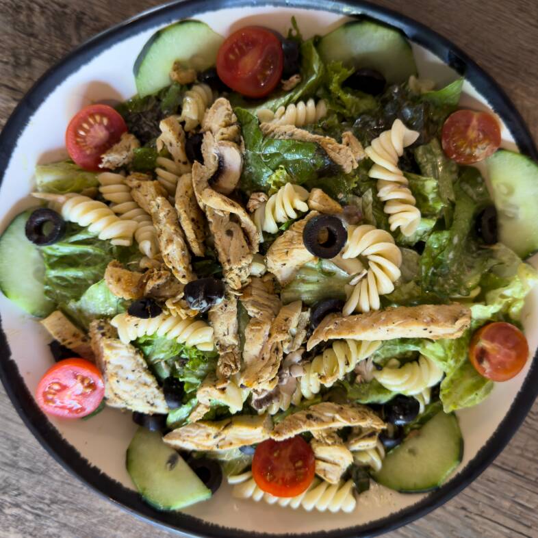 Mix de lechugas con 80 gr de pollo al limón, pasta fusilli, pepino, tomate cherry y aceituna negra, servida con aderezo de cilantro.