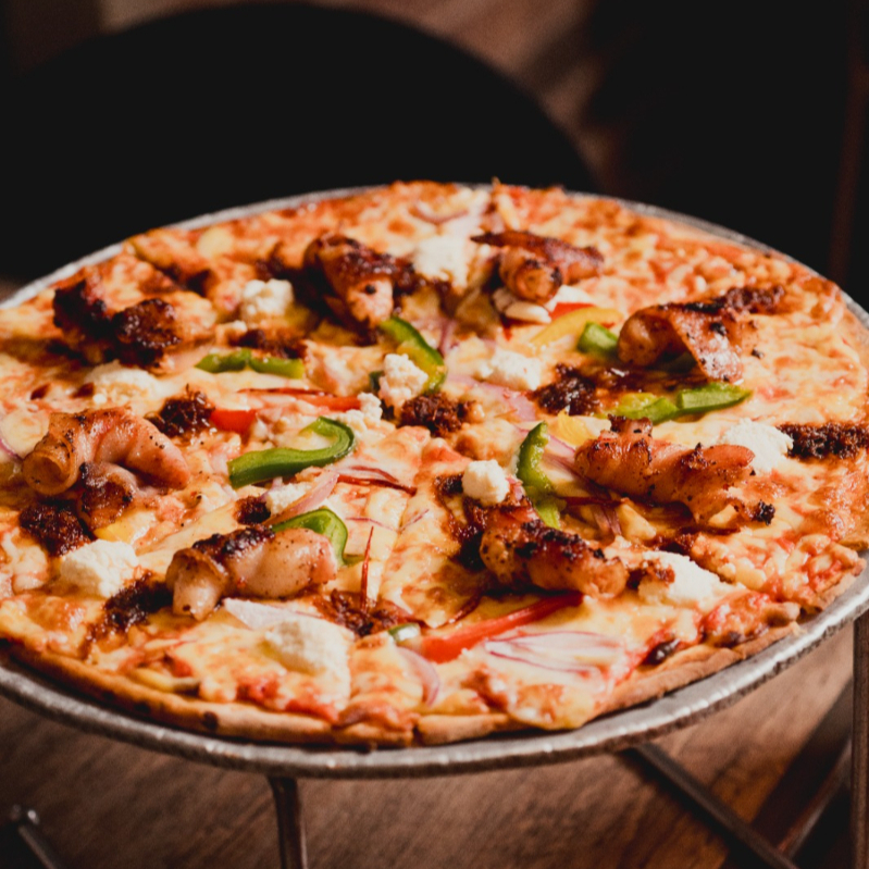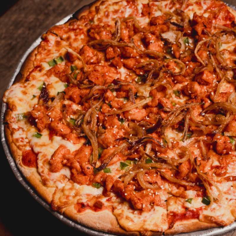 Pizza con mix de quesos, salsa pomodoro y mornay, chilorio, morrón y cebolla morada, con requesón, camarones momia y un toque de chile de árbol.