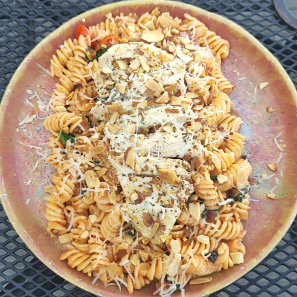 Fusilli con pollo, espinaca y toma- te deshidratado en salsa cremosa con vino blanco, albahaca y parmesano.