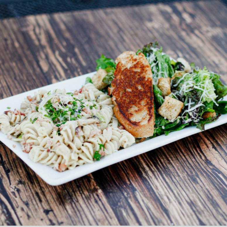 Pasta fusilli con salsa Alfredo + Tocino + Ensalada + Pan con mantequilla.