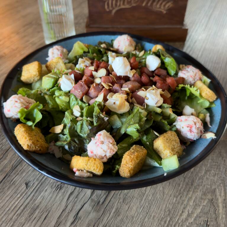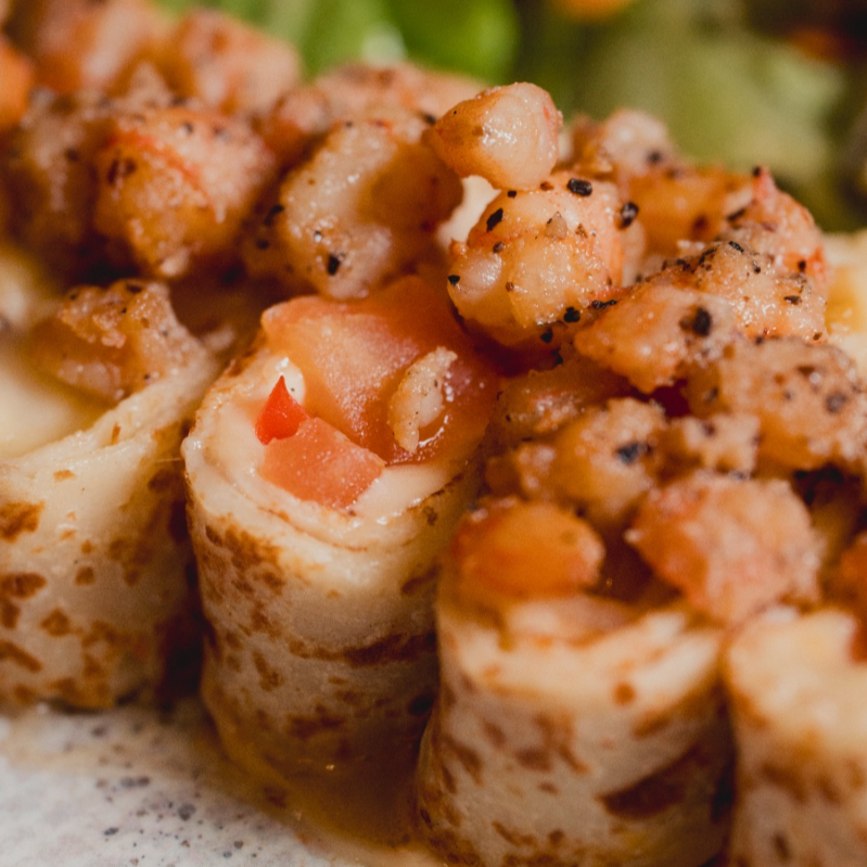 Nuestra crepa salada con un toque del mar, crema de marines a la mantequilla y salsa gobernador con nuestro mix de quesos Dolce acompañado de ensalada y borrones frescos