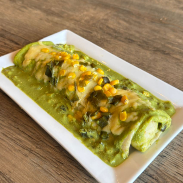Pollo al limón, mix de quesos, chile poblano, elote y champiñón, bañada en salsa poblana.