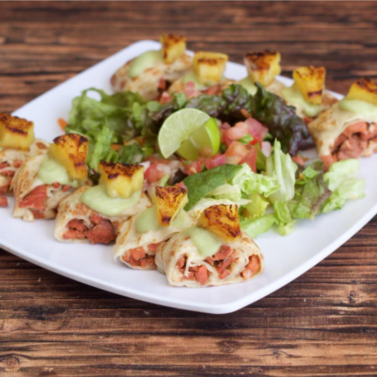 Carne adobada, piña, salsa mexicana, salsa de aguacate
