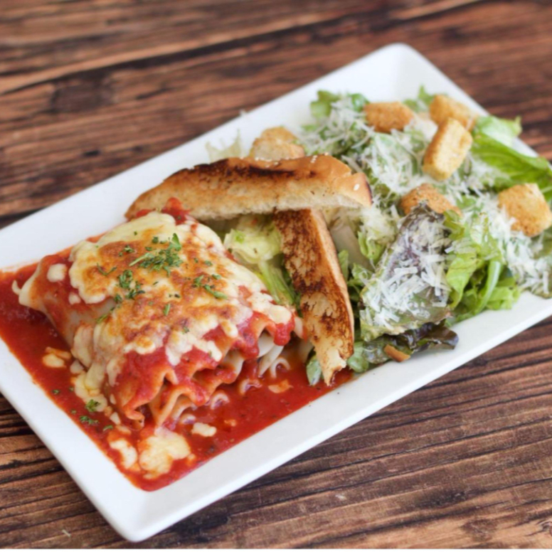 Clásica lasagna siciliana con carne molida, champiñones y espinacas, bañadas en nuestra salsa pomodoro y queso gratinado al horno de leña.