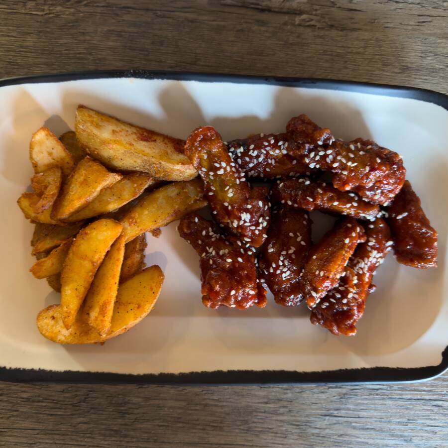 300G de alitas y 250g de boneless bañados en tu salsa favorita, 3 pz de dedos de queso, 300g de papas gajo y vegetales, acompañados de aderezo ranch.