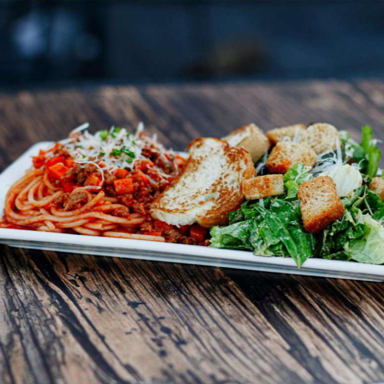 Spaguetti, salsa pomodoro, carne molida, zanahoria, + Mix de lechuga con aderezo césar + Pan con mantequilla.