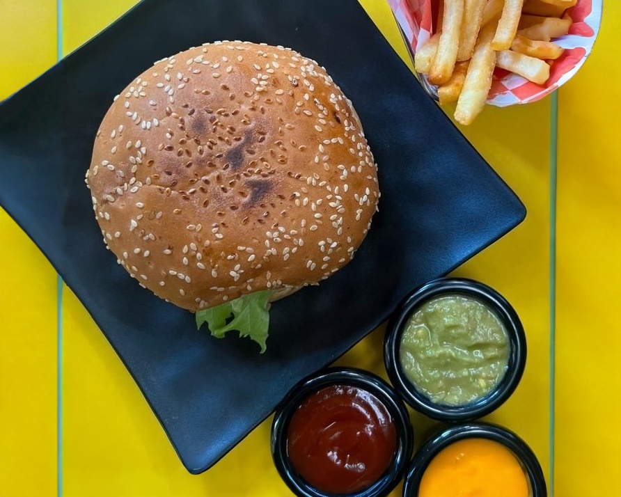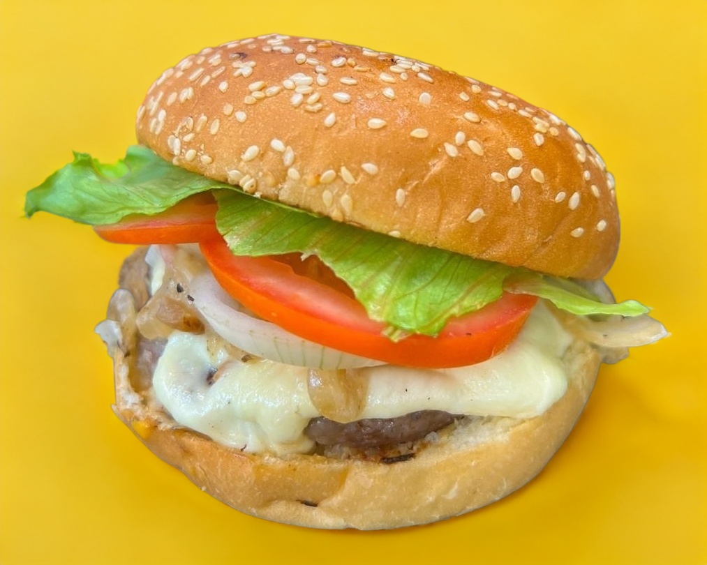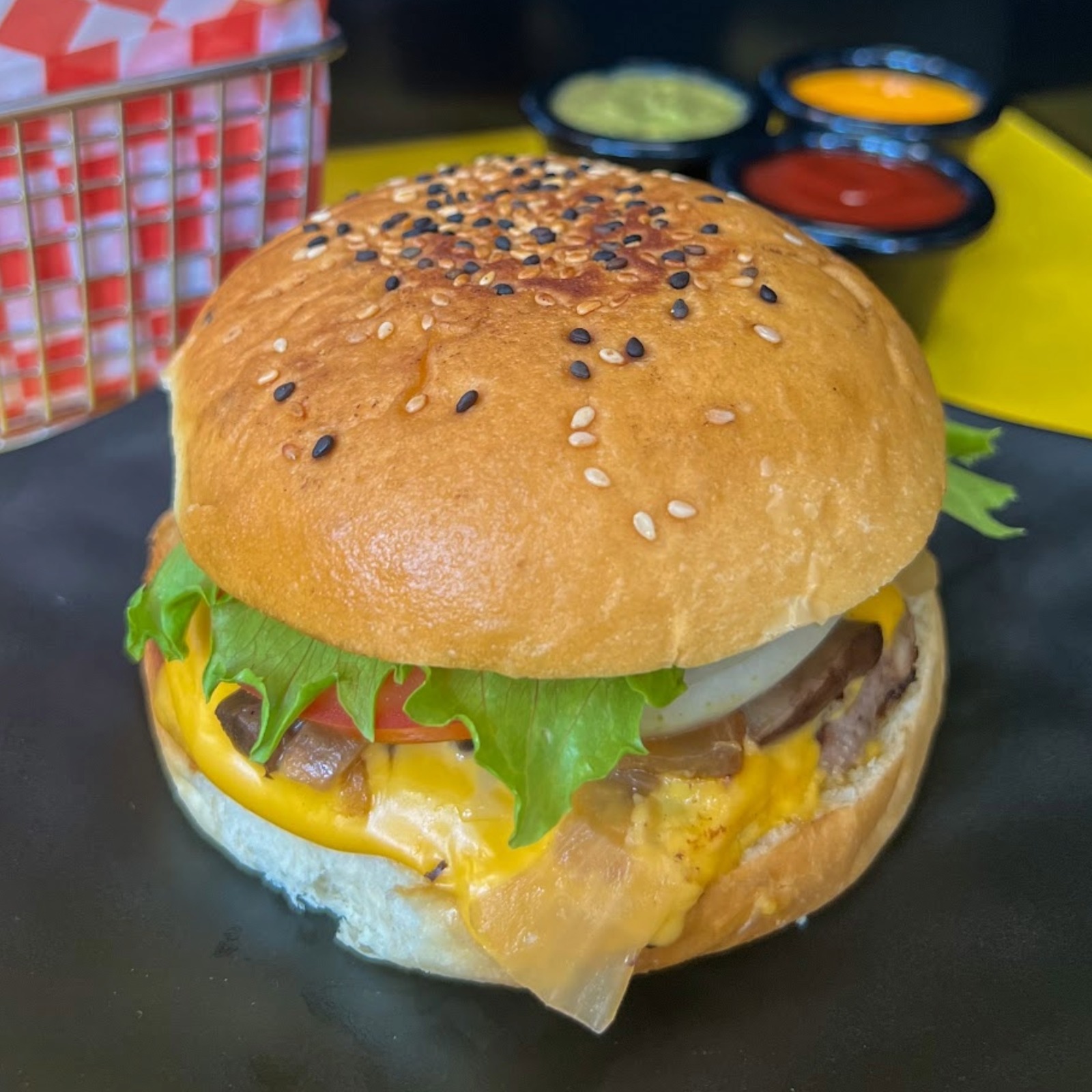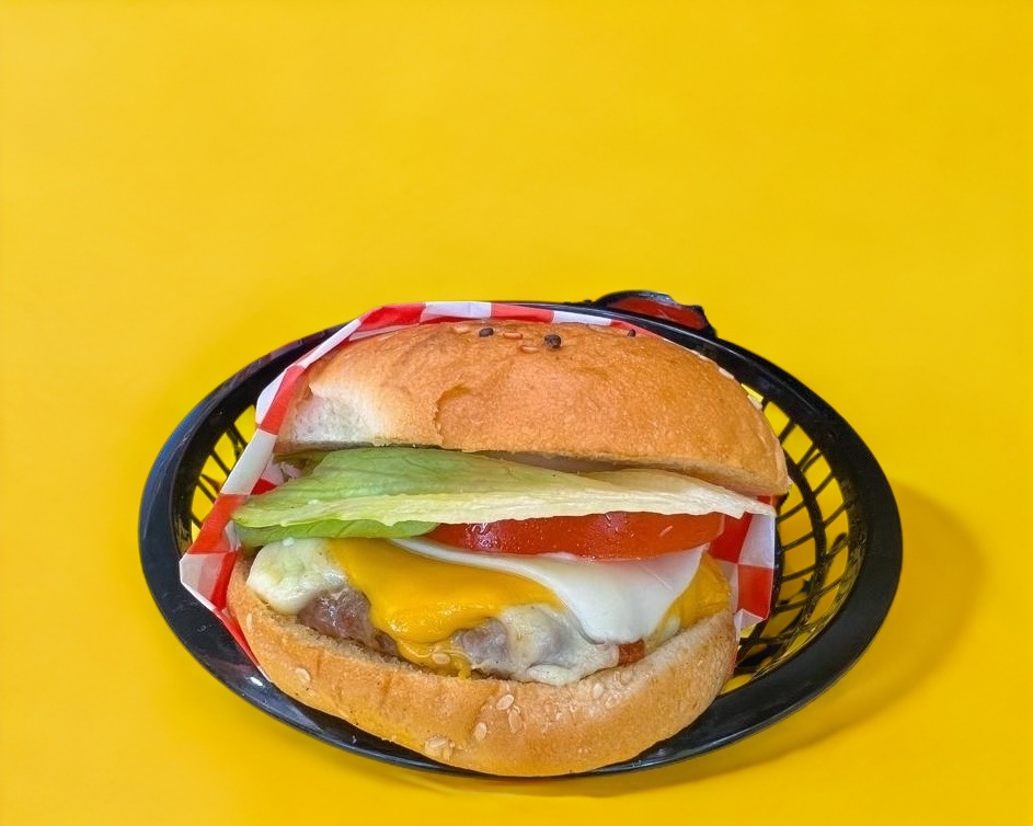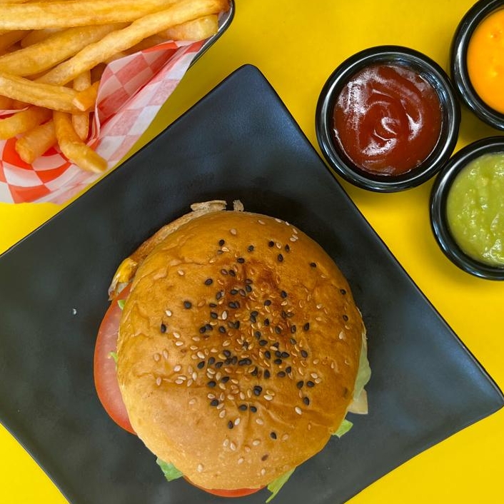 Carne casera 100 por ciento de res, queso americano, verduras, aderezos a elegir y papás a la francesa.