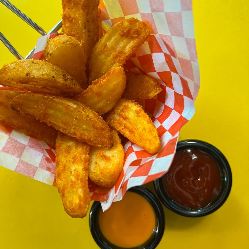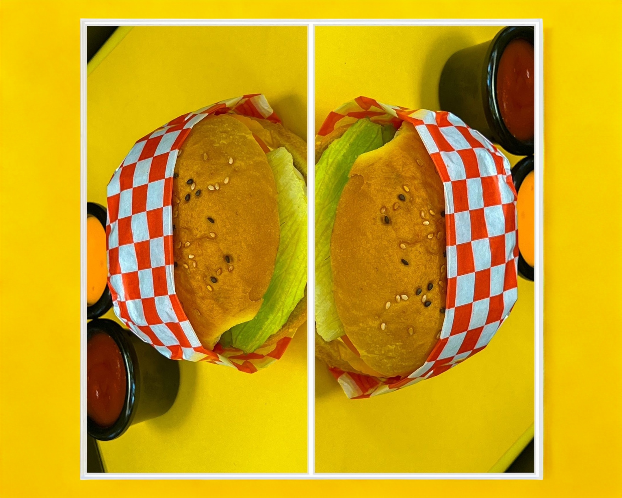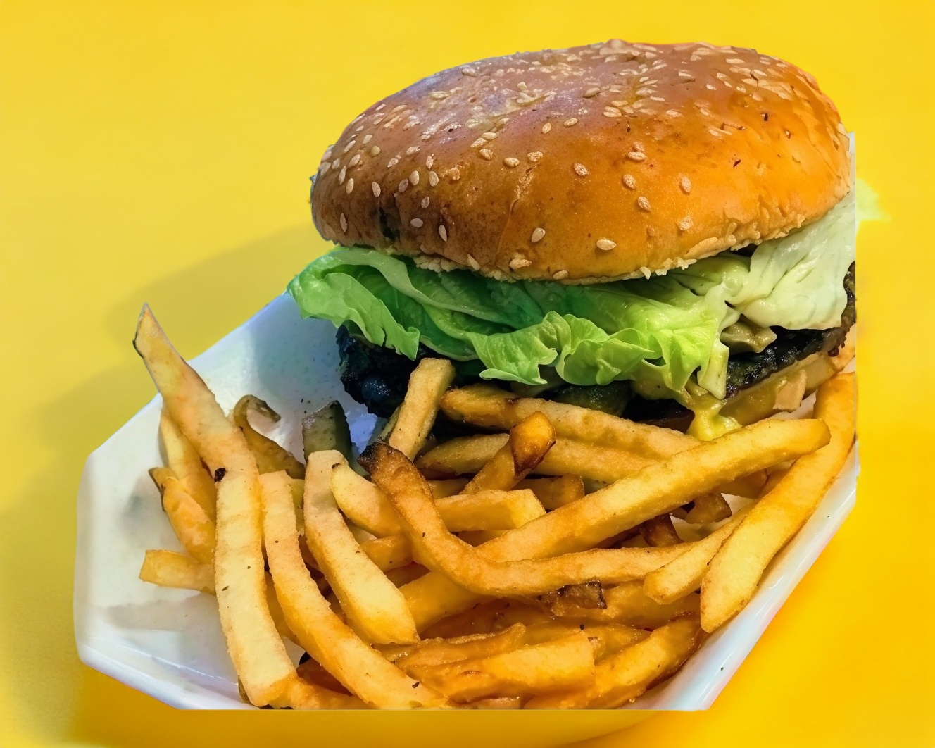 Carne casera 100 por ciento de res, queso americano, verduras, aderezos a elegir y papás a la francesa.