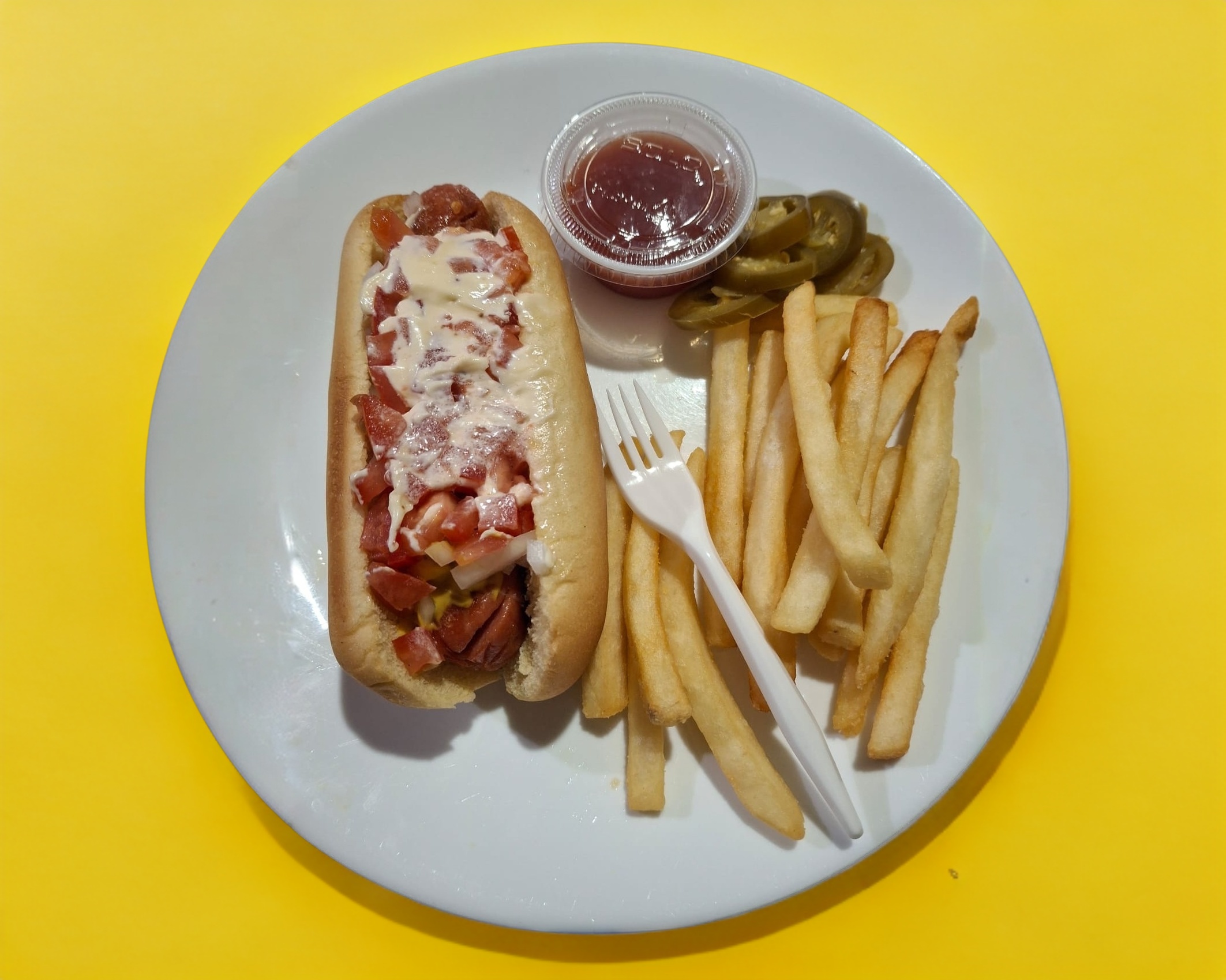 Pan media noche Bimbo,salchicha de pavo fud con tocino,tomate,cebolla,mayonesa,catsup ycon papás a la francesa
