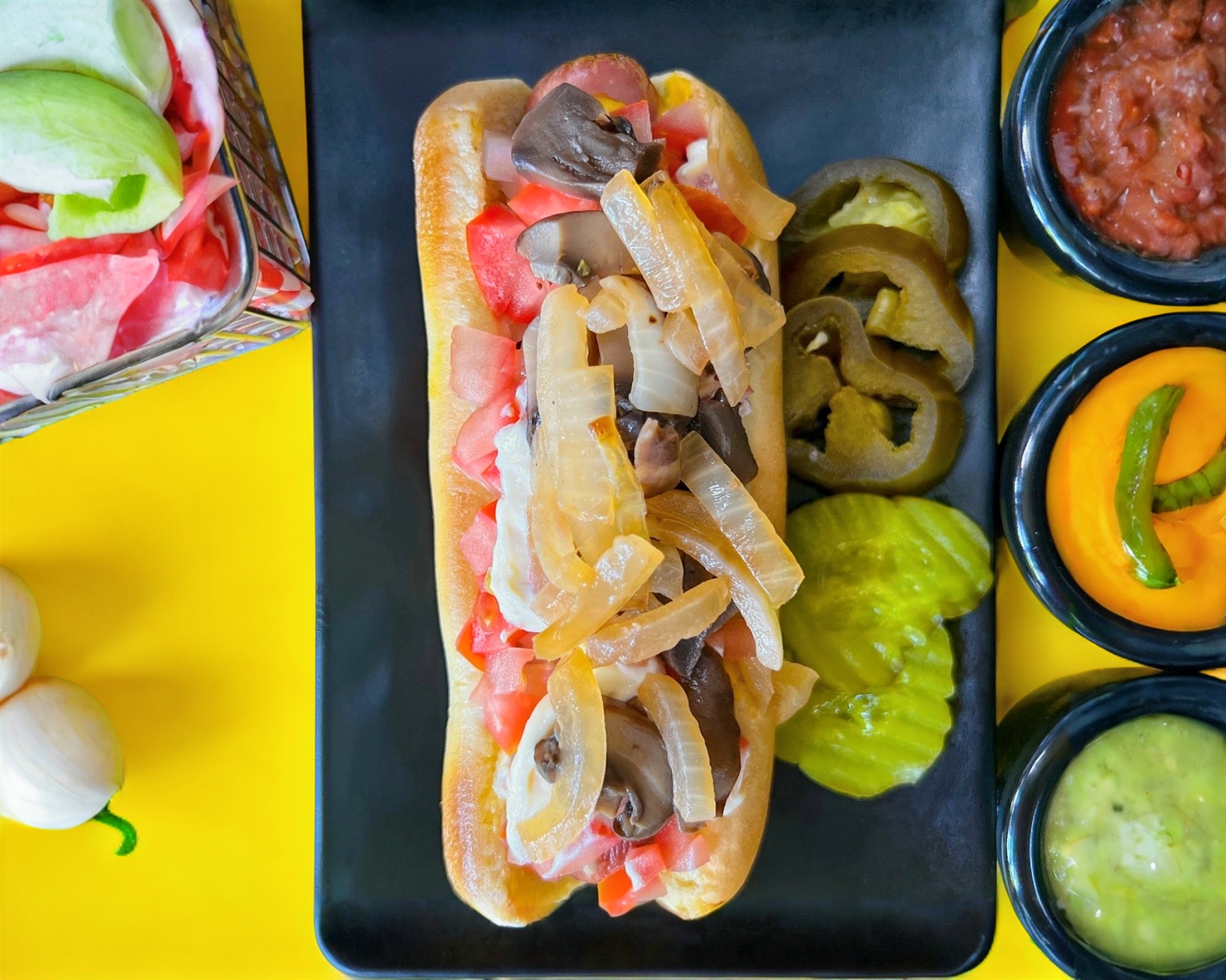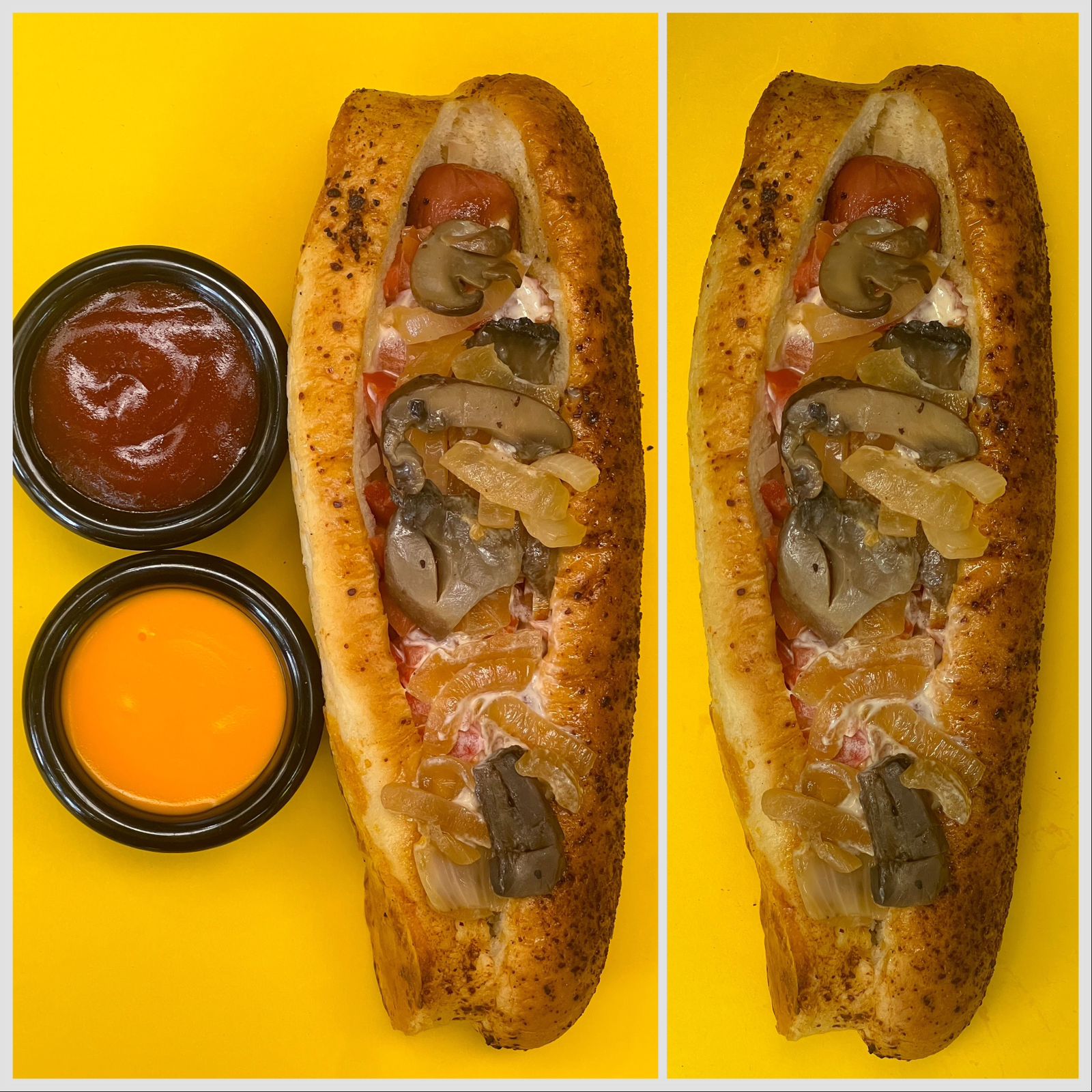 Preparado con salchicha jumbo max (25 cm) tocino pan artesanal sabor parmesano gratinado con queso monterey Jack incluye tomate cebolla picada y cebolla asada champiiñones catsup guacamole aderezo para nachos chiles pepinillos y papas a la francesa