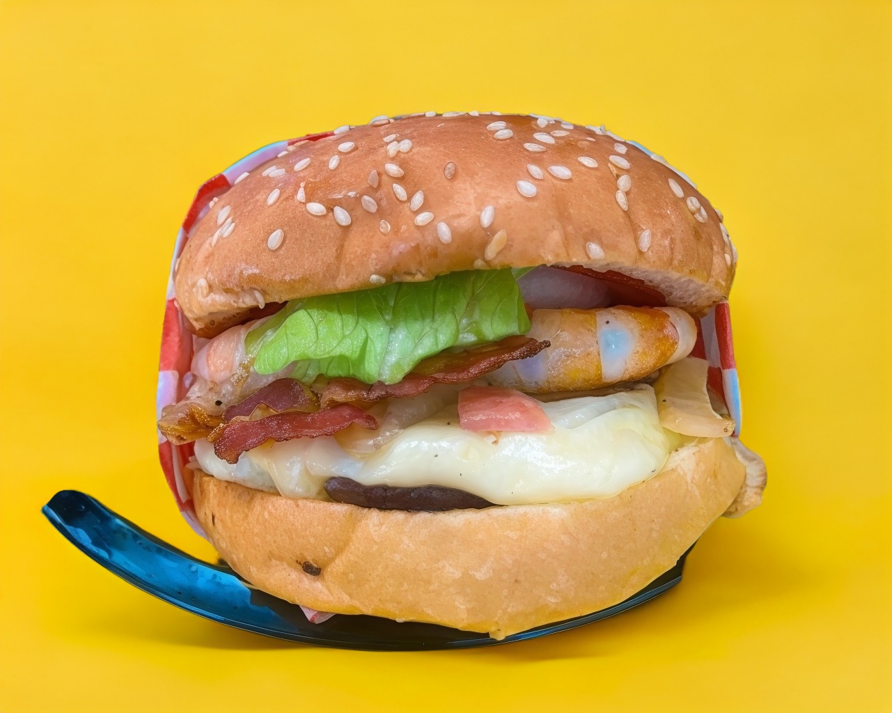Pan artesanal,salchicha jumbo de pavo con tocino,jamon de pierna,queso americano,quesogratinado,aderezos,verduras y papas