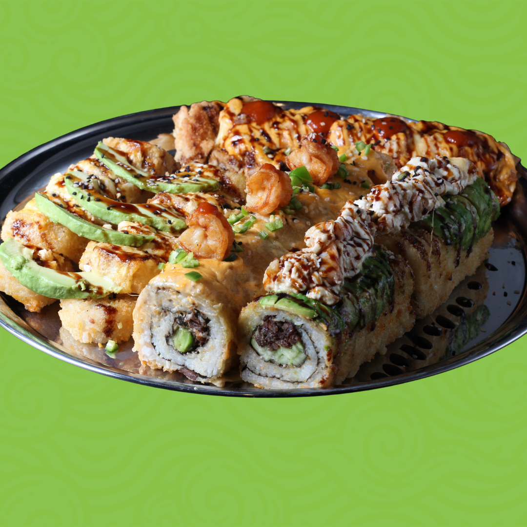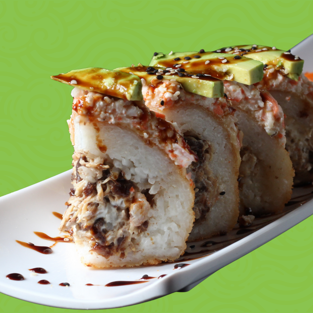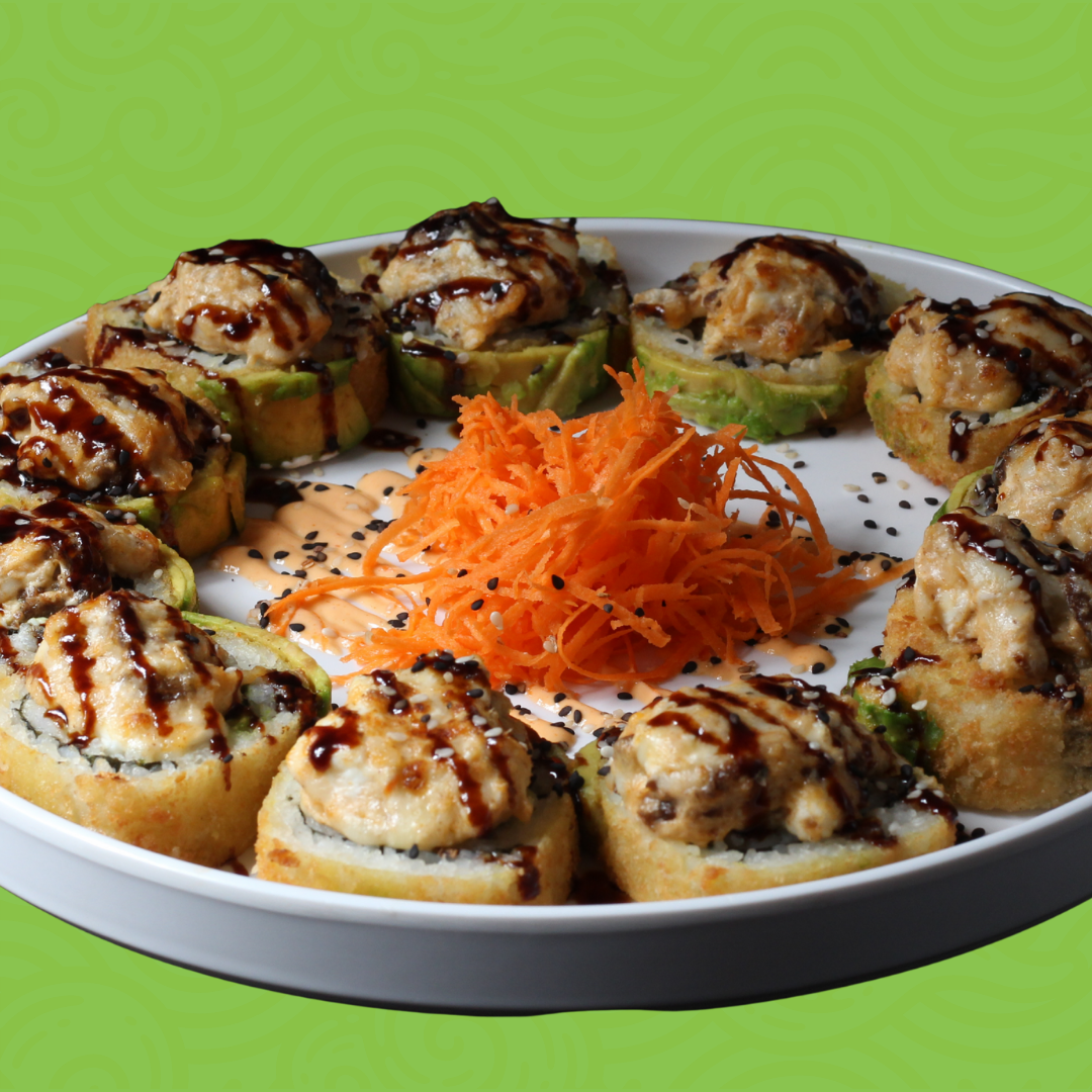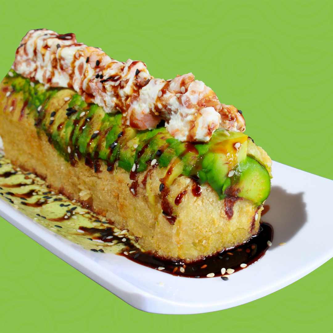 Chile caribe capeado, releno de philadelphia, queso chihuahua, tampico spicy, res, pollo y camarón. Topping rajitas de aguacate salsa de anguila y ajonjolí. Acompañada de arroz blanco.