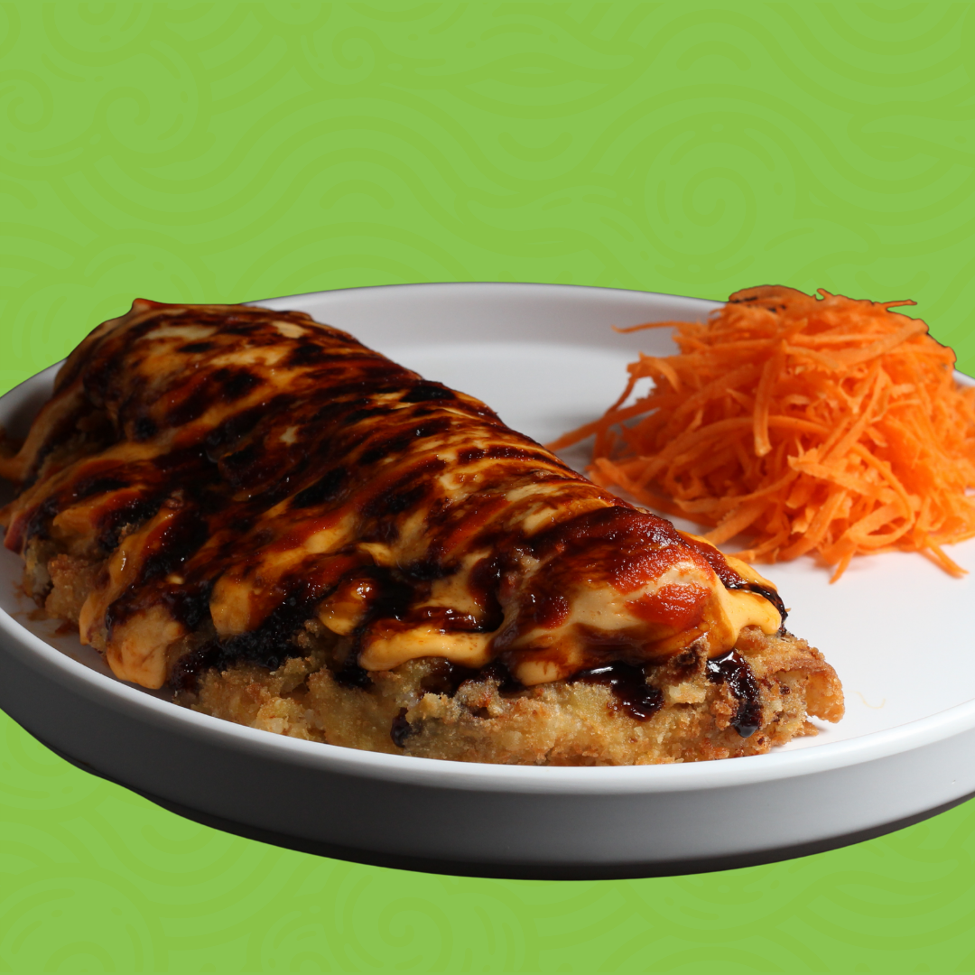 P.D- Res, Pollo y Tocino. Topping de Tampico especial con camarones, bañado con aderezo especial. Empanizado horneado.