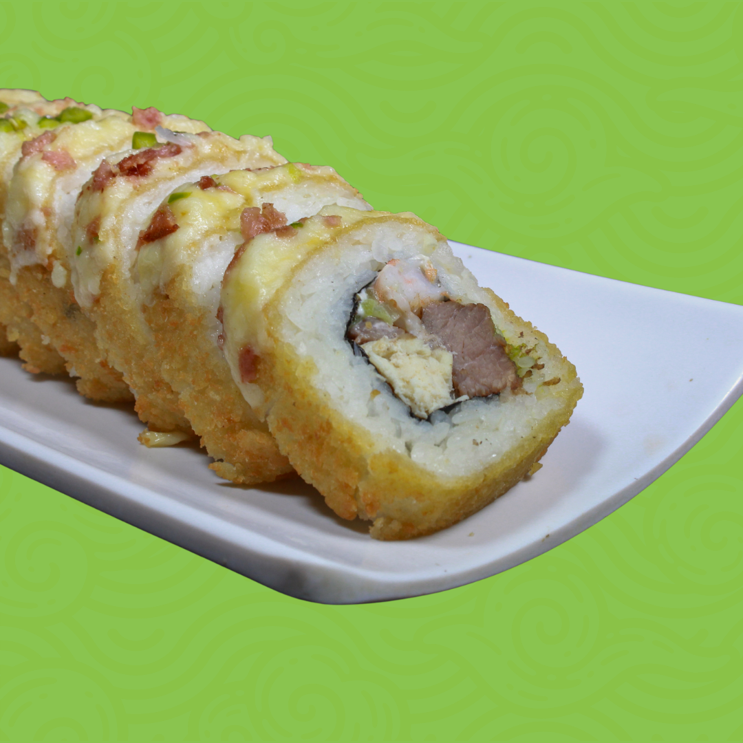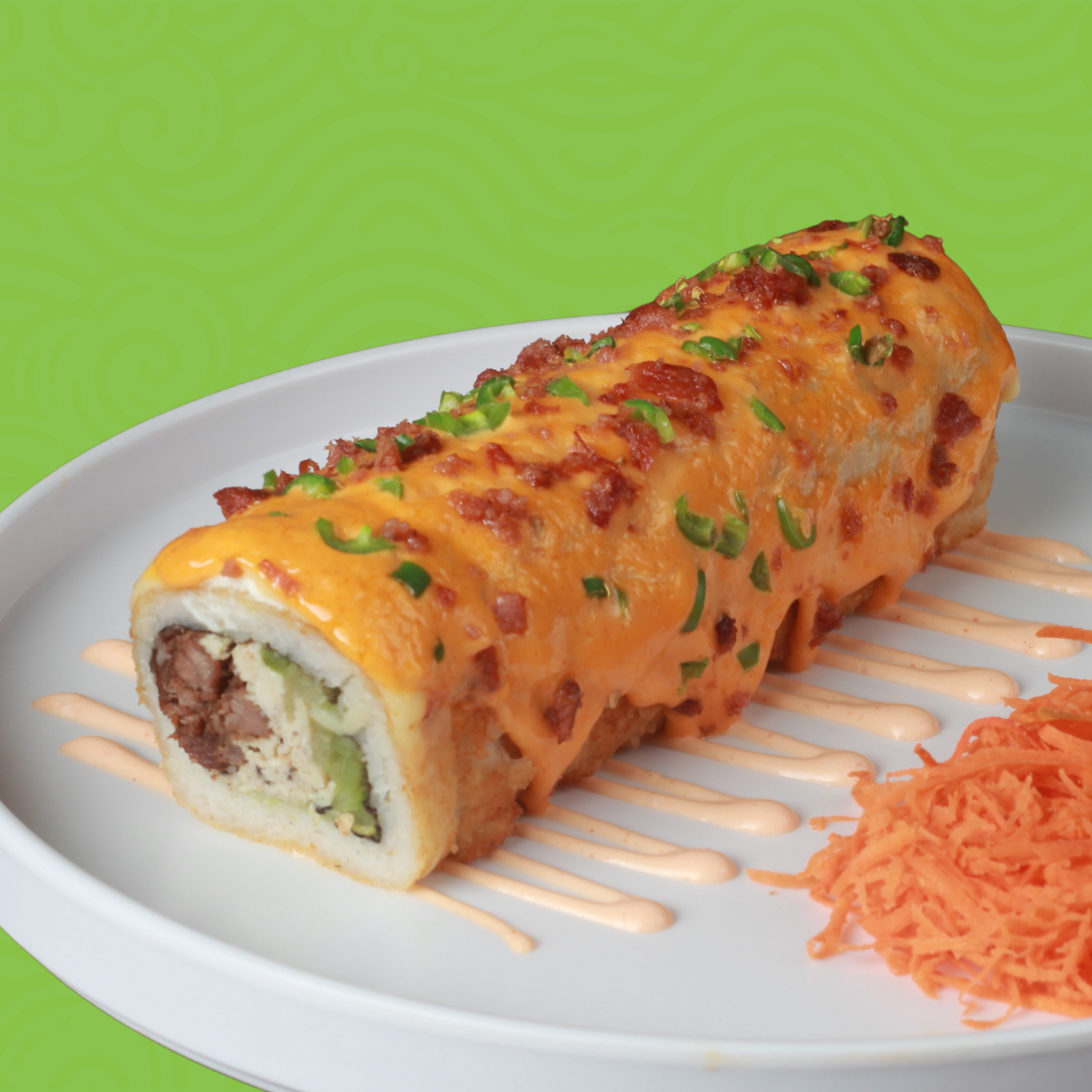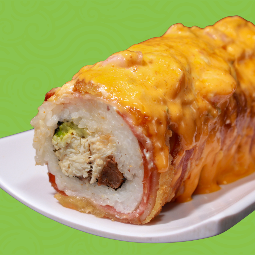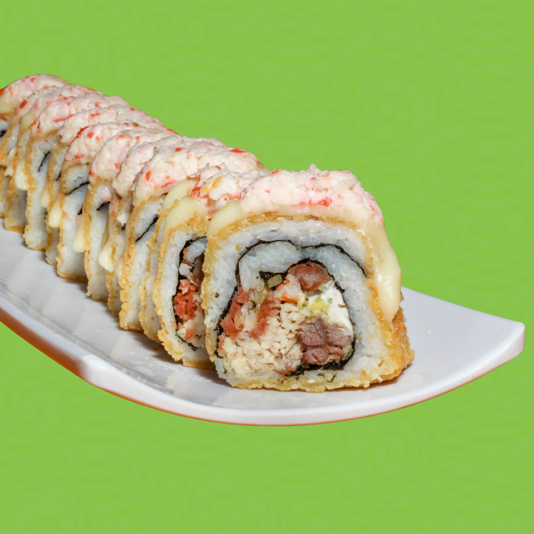1 Pieza. Mezcla de philadelphia, tampico, res, pollo, caribe picado y un poco de arroz. Gratinado y horneado con aderezos con un toque de tocino y serrano.