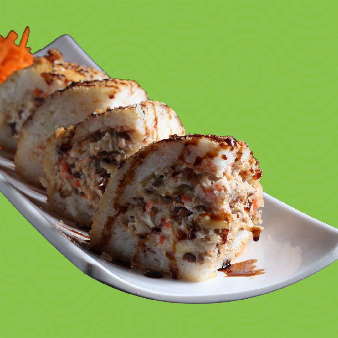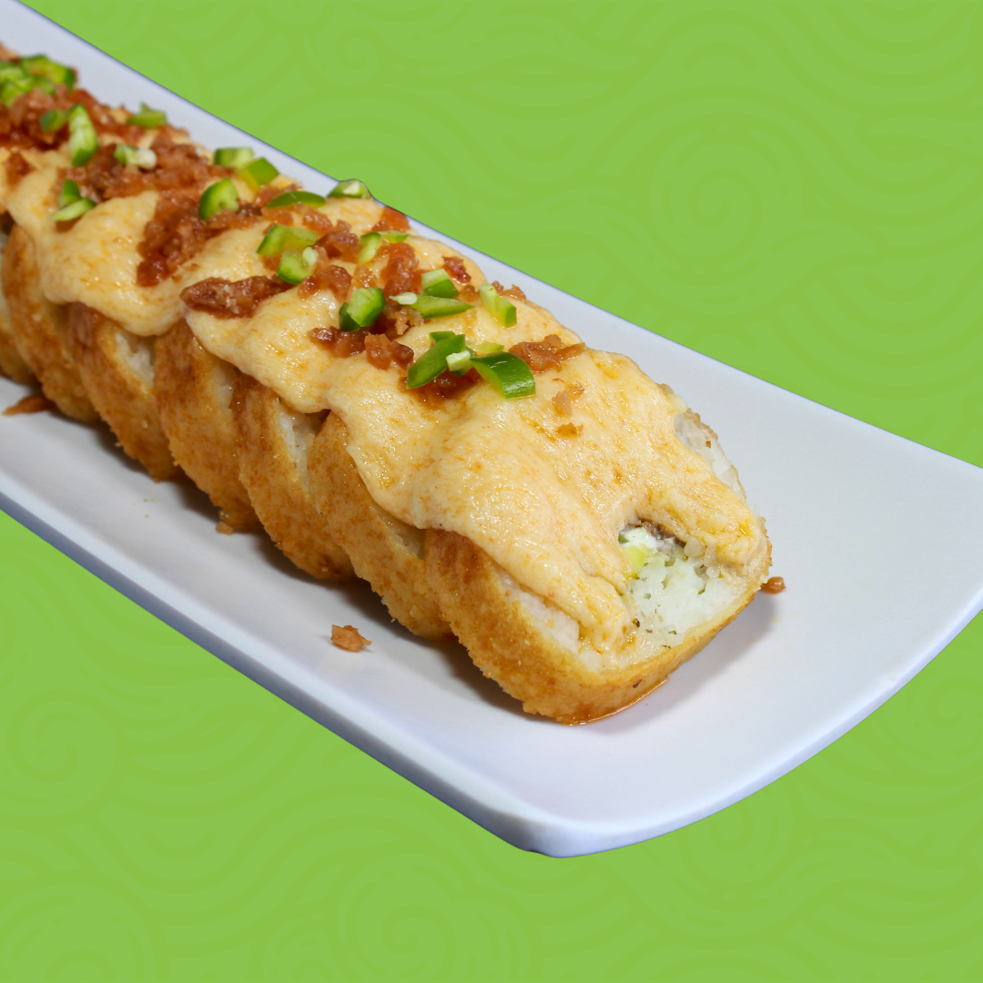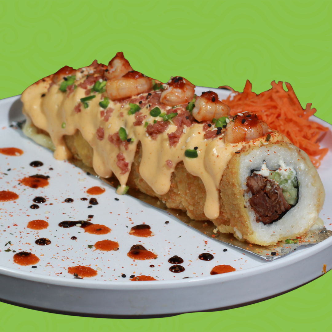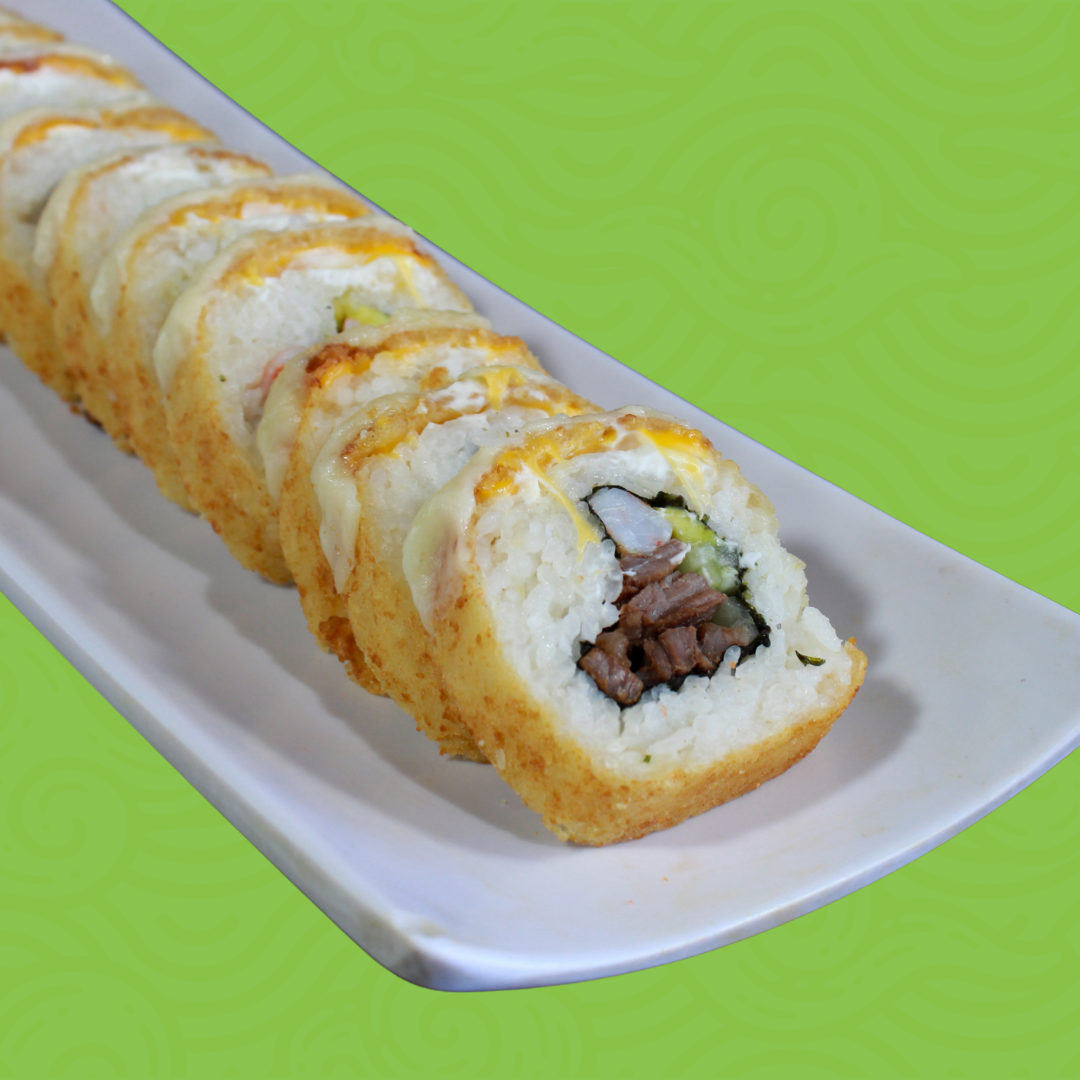 1 Pieza. Mezcla de philadelphia, tampico, res, pollo, caribe picado y un poco de arroz. Gratinado y horneado con aderezos con un toque de tocino y serrano.