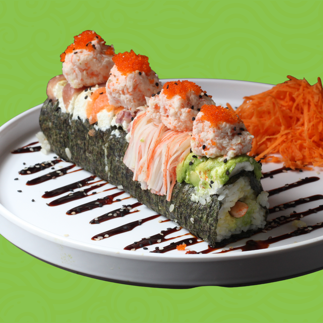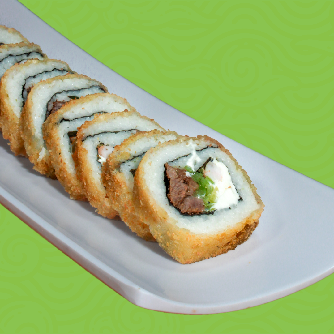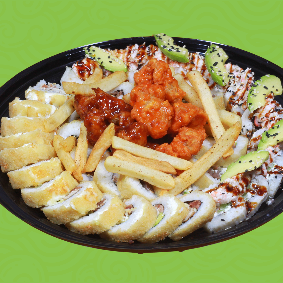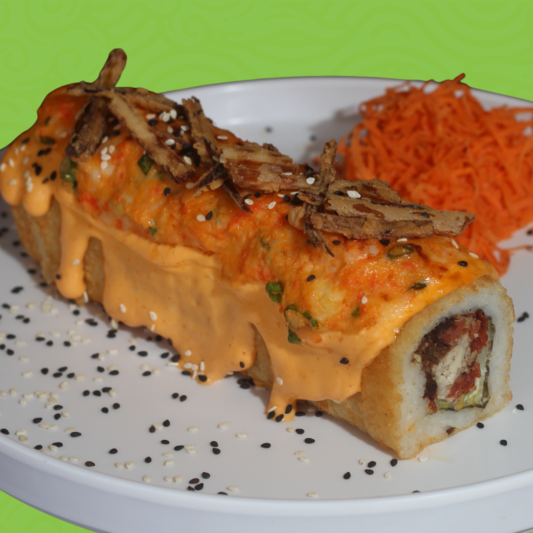 1 Pieza. Mezcla de philadelphia, tampico, res, pollo, caribe picado y un poco de arroz. Gratinado y horneado con aderezos con un toque de tocino y serrano.