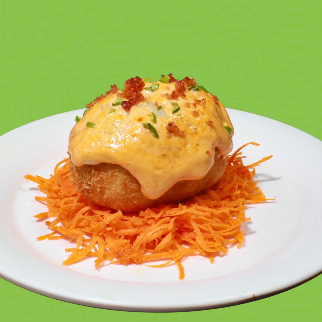 P.D- Res. P.F- Gratinado y aderezo especial. Topping de Tocino, chile serrano y camarones. Empanizado horneado.
