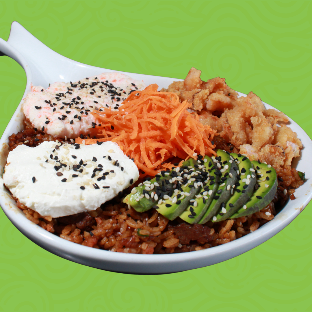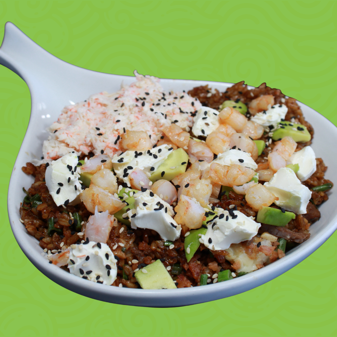 Arroz frito con res y tocino salteado con queso chihuahua, coronado con cubitos de philadelphia, aguacate, camarones y tampico.