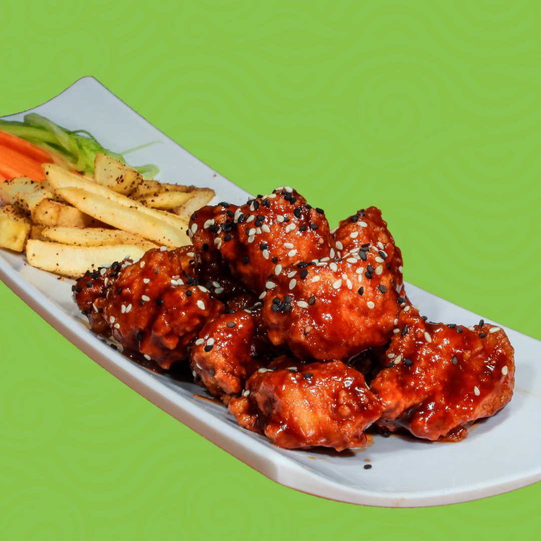 Pollo capeado. Acompañados de papas y vegetales (salsas, buffalo, bbq o dulces).