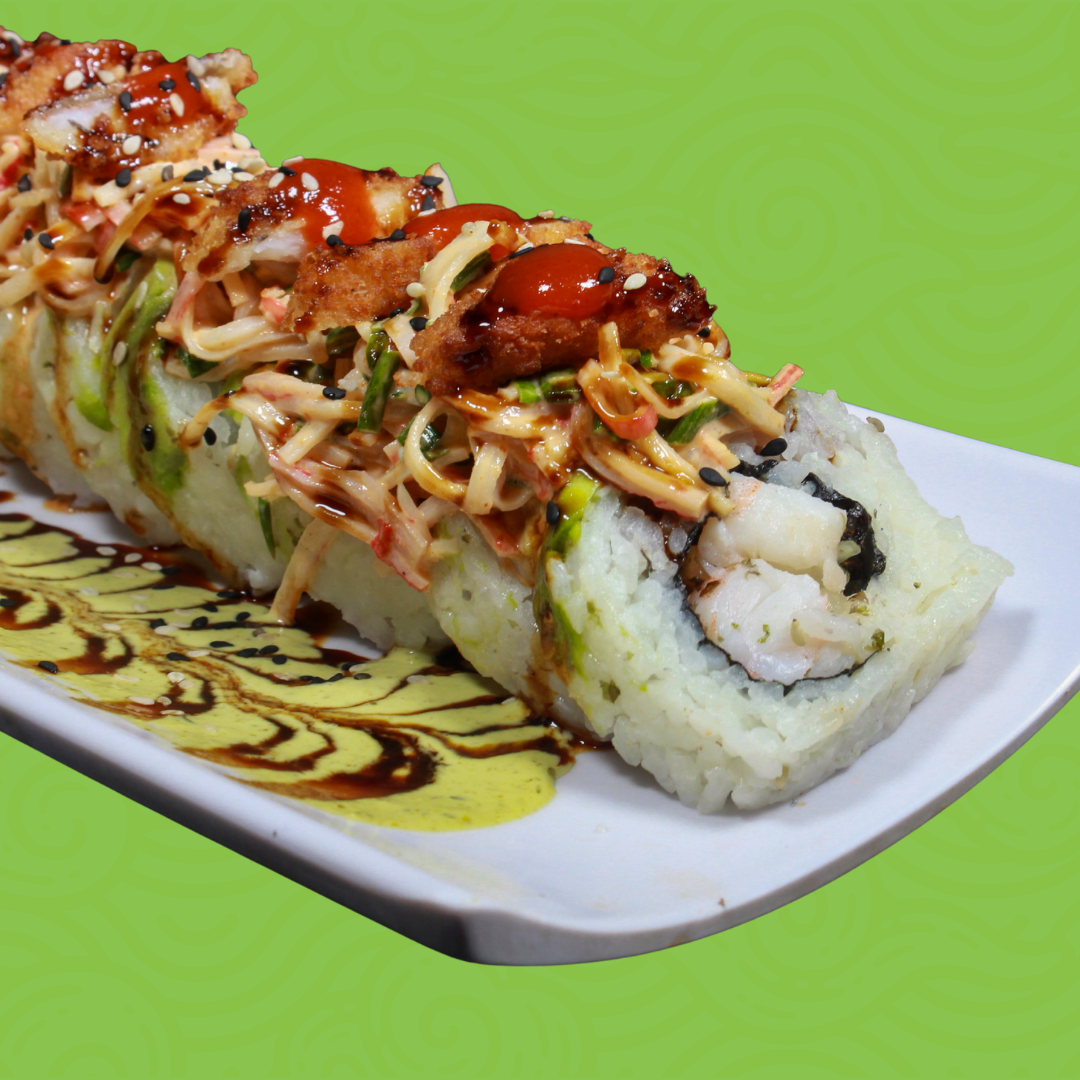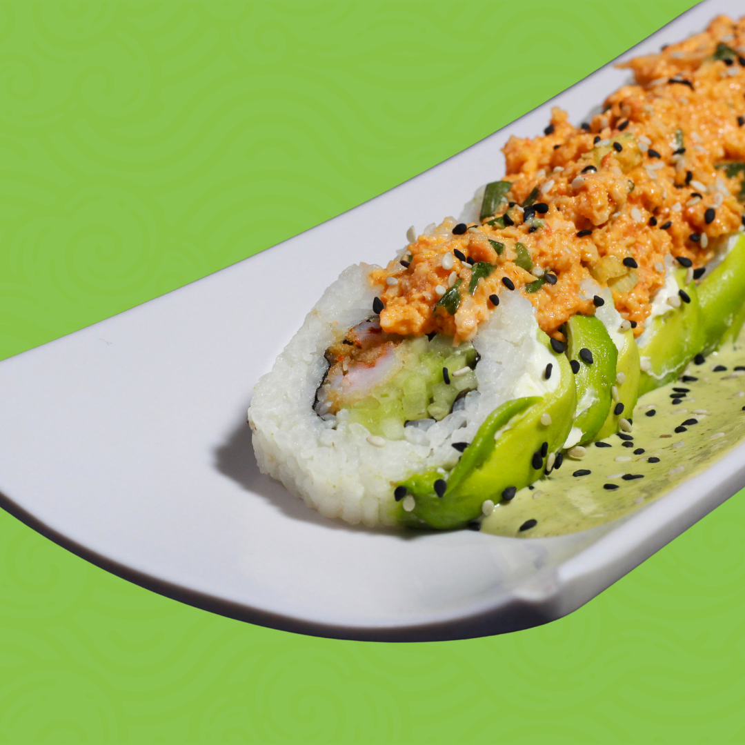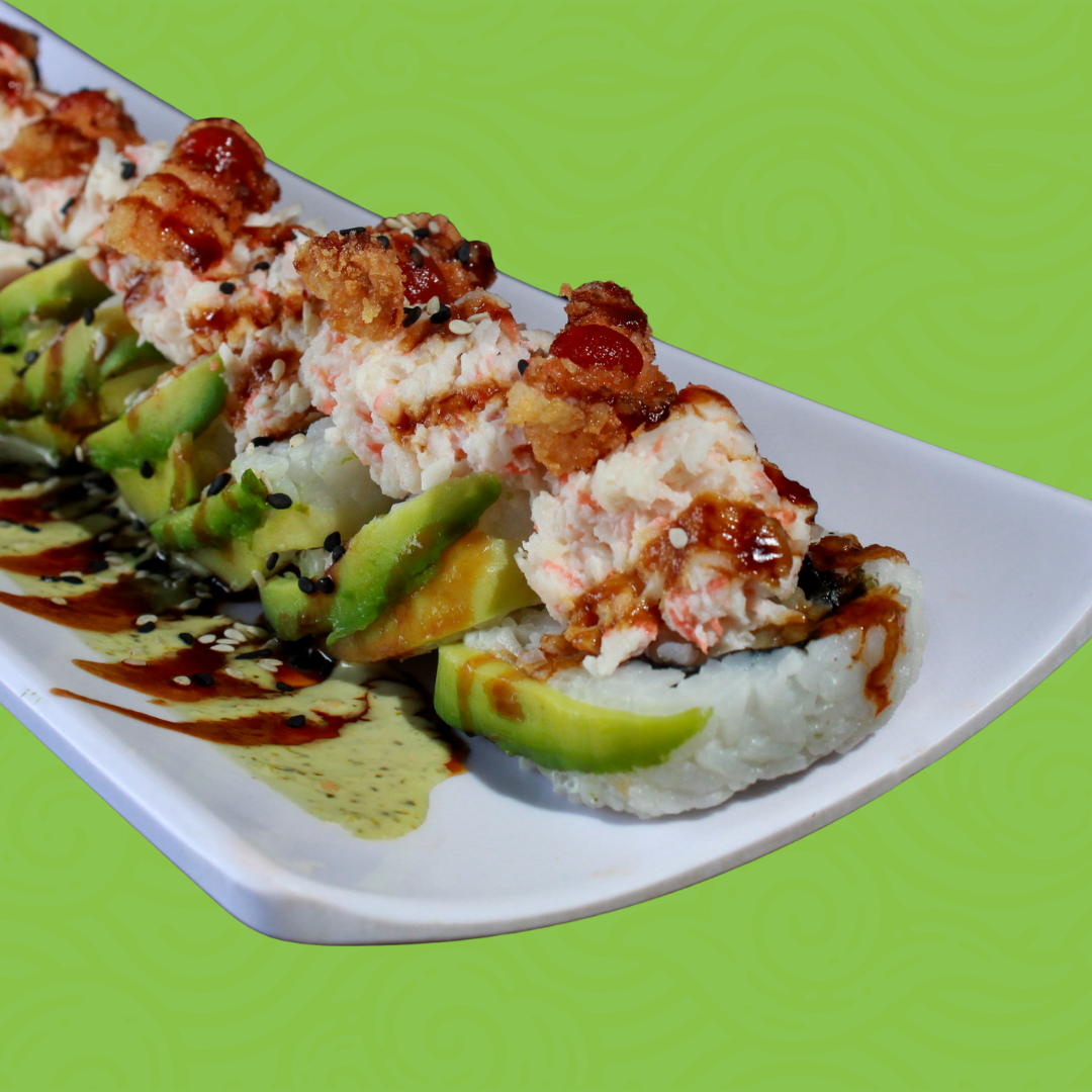 P.D- Cangrejo. P.F- Forrado de Aguacate. Topping de Tampico, Camarones Empanizados. Bañado en salsa de anguila, Puntos de sriracha y ajonjolí. Acompañado de aderezo cilantro.