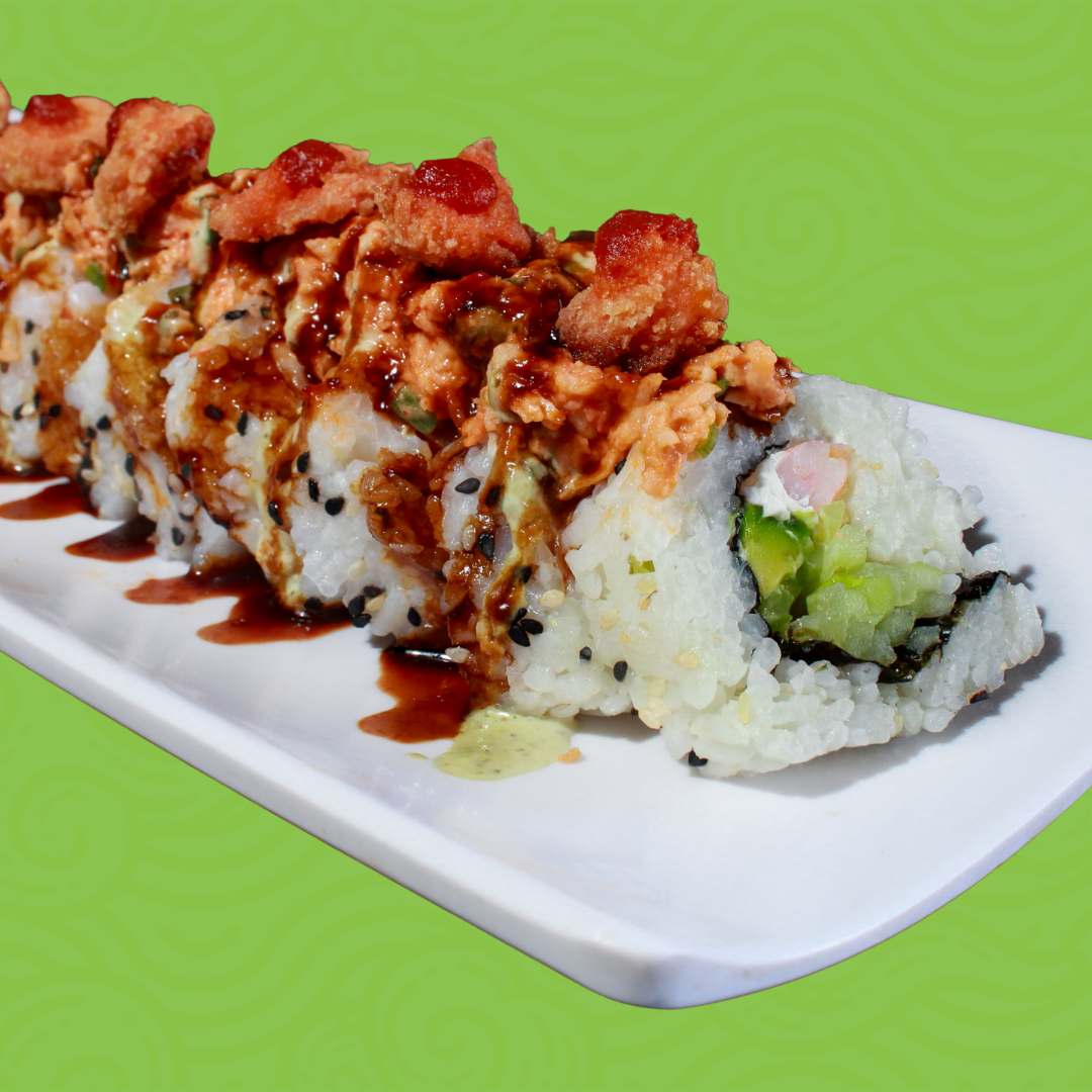 P.D- Camarón. P.F- Ajonjolí. Topping de tampico spicy con chicharrones de salmón empanizados bañado en aderezo cilantro, salsa de anguila y sriracha.